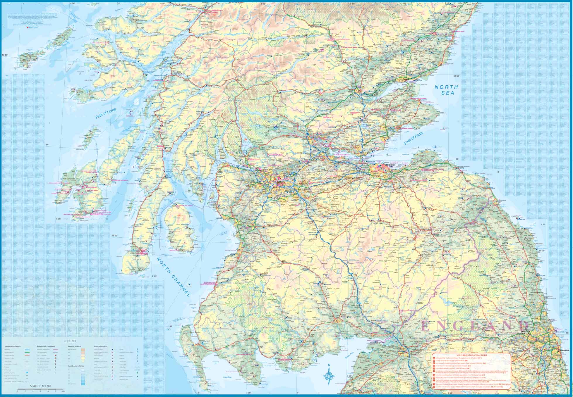 What does the word ‘Scotland’ mean to first-time visitors to the country? The history of the nation is fascinating and, being of Scottish ancestry myself, the castles and battlefields that have shaped Scottish history for a thousand years is a big attraction. On this map, we have emphasized the top ‘must see’ castles, including my clan home, Eileen Donan (Mackenzie clan). These have been highlighted in blue and we would be happy to add more wonderful castles open to the public in future editions. The top whisky distilleries of the nation are actually a huge tourist attraction, with tours and sampling sessions and deserve emphasis for this reason alone! They are highlighted in magenta and, again, we would be happy to add more in the next edition – hic! For good measure, we have added a list of the top ‘other’ attractions of Scotland, such as Loch Ness and Robert Burns’ birthplace. The joy of this map is that it is an excellent road/rail map of Scotland, based thematically, double-sided.
