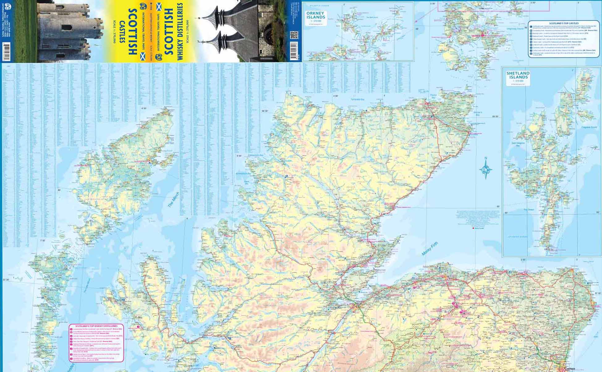 Een speciale versie van de ITMB wegenkaart van Schotland, naast de gebruikelijke aanduidingen van o.a. nationale parken en vliegvelden worden ook kastelen en whisky distilleerderijen op de kaart weergegeven.