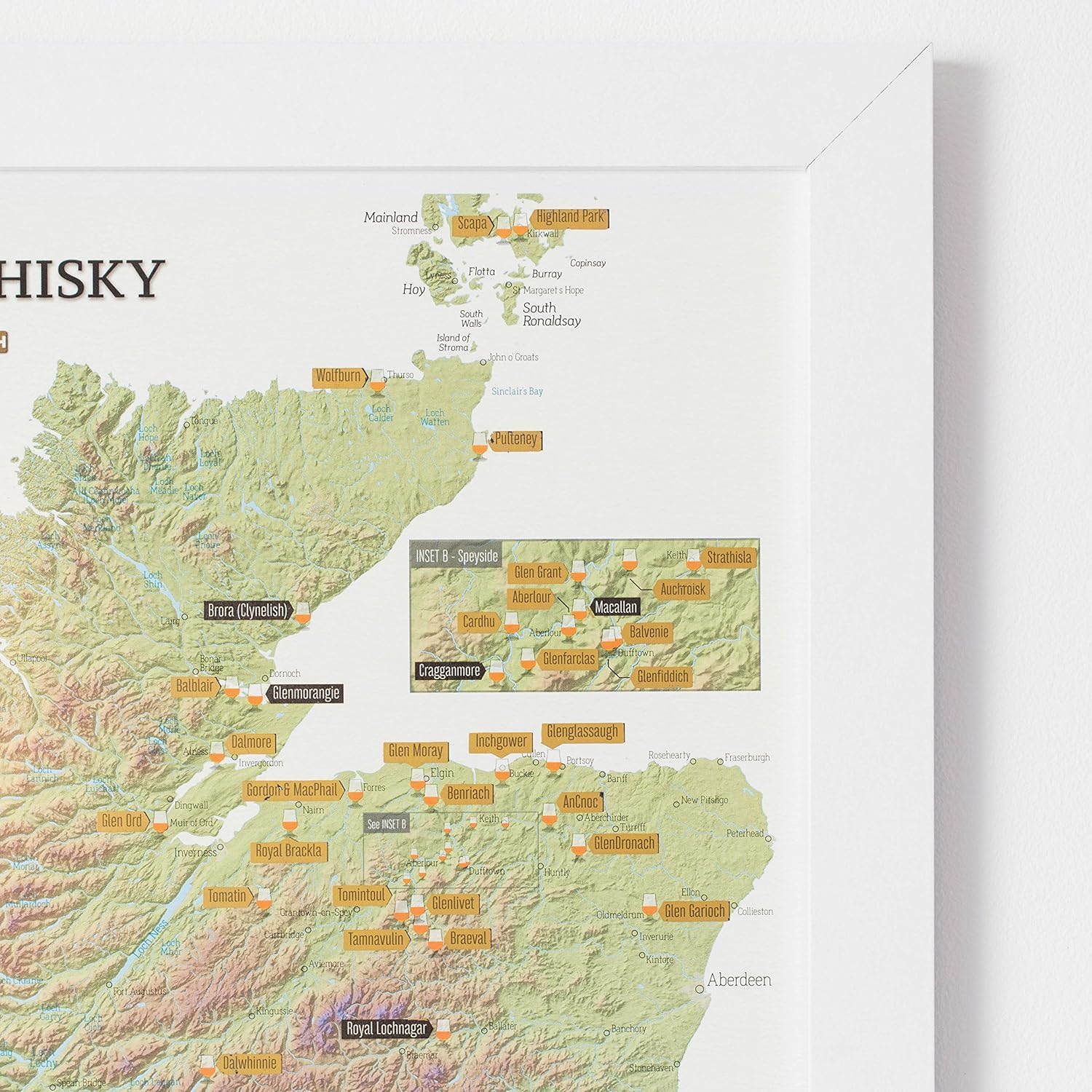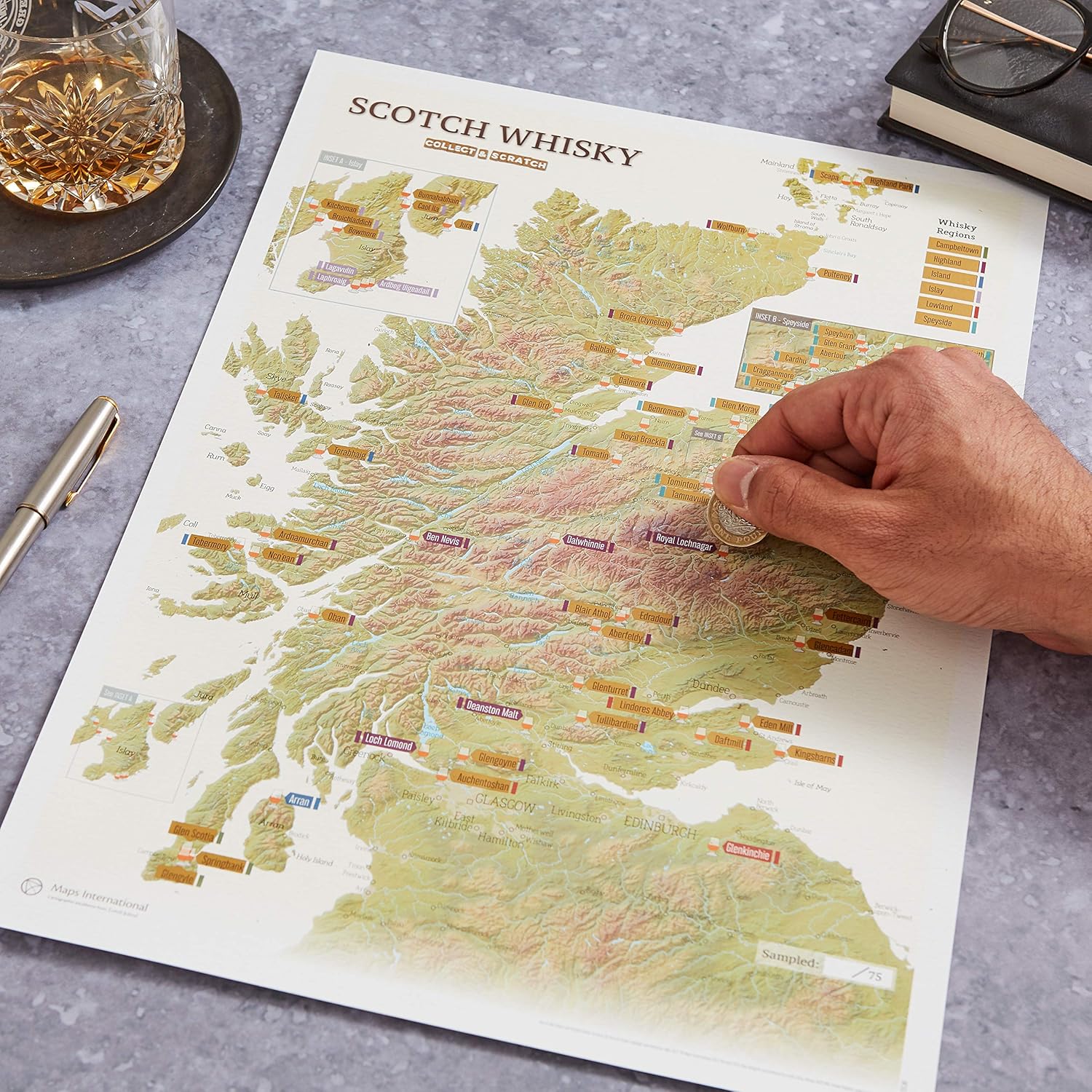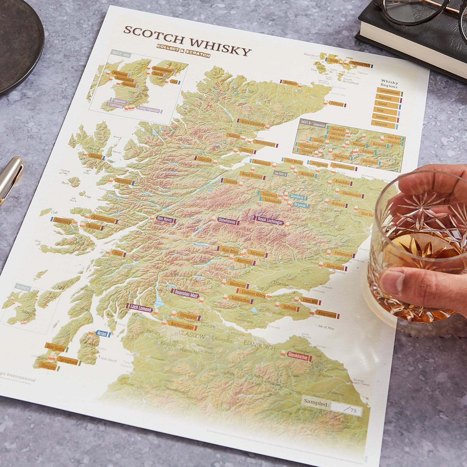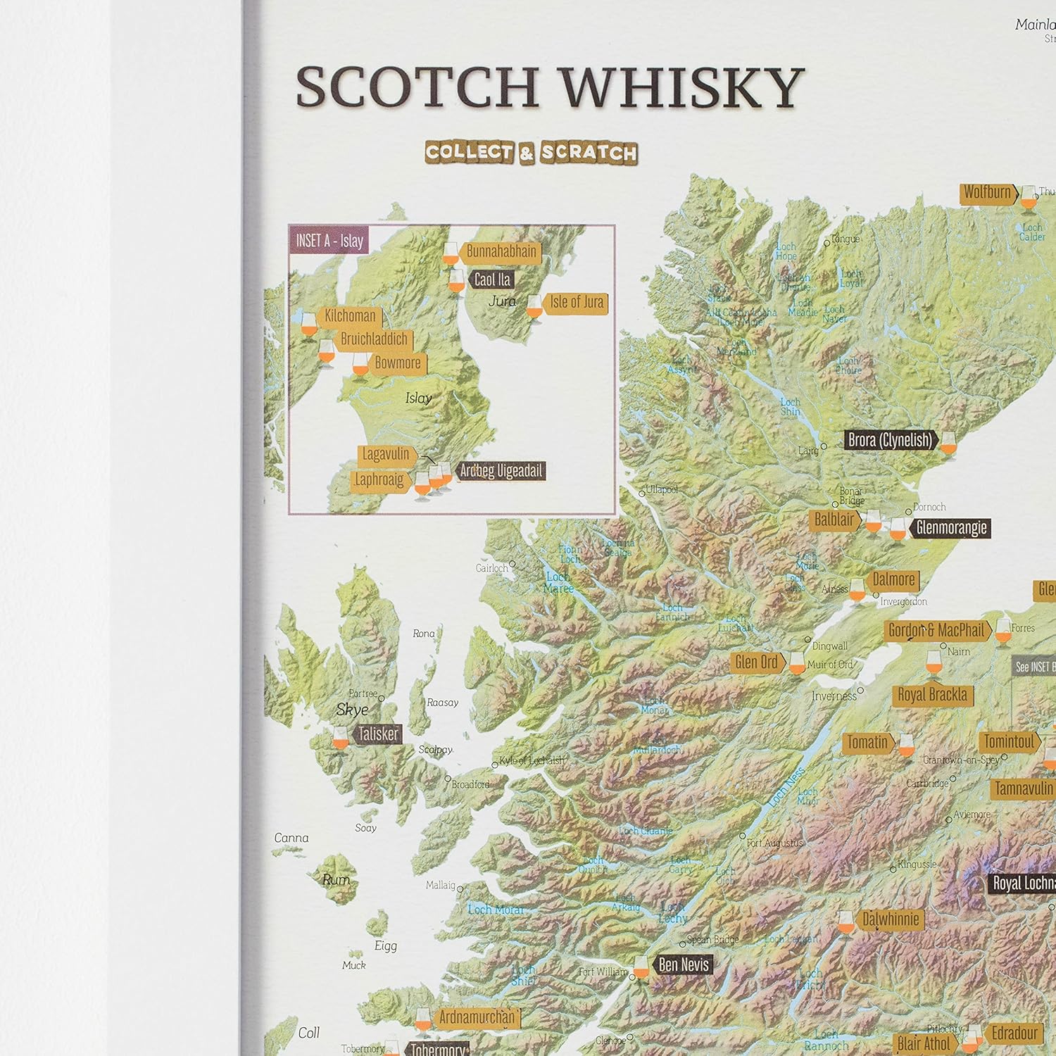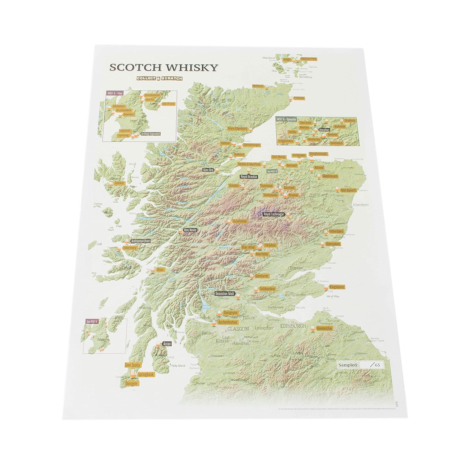 Prachtige kaart en erg gedetailleerd met mooie scratch labels om de geproefde of bezochte whisky’s aan te merken , Top!!