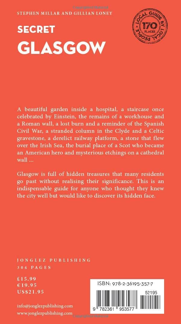 The places included in our guides are unusual and unfamiliar, allowing one to step off the beaten track. In its 1st edition, Secret Glasgow features 150 secret and unusual locations. Inside Secret Glasgow :A beautiful garden inside a hospital, a staircase once celebrated by Einstein, the remains of a workhouse and a Roman wall, a lost burn and a reminder of the Spanish Civil War, a stranded column in the Clyde and a Celtic gravestone, a derelict railway platform, a stone that flew over the Irish Sea, the burial place of a Scot who became an American hero and mysterious etchings on a cathedral wall ...