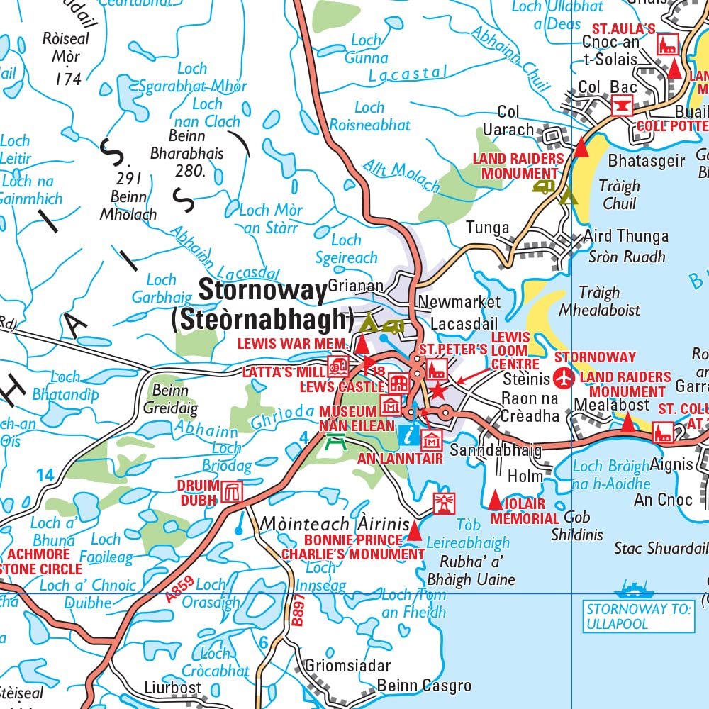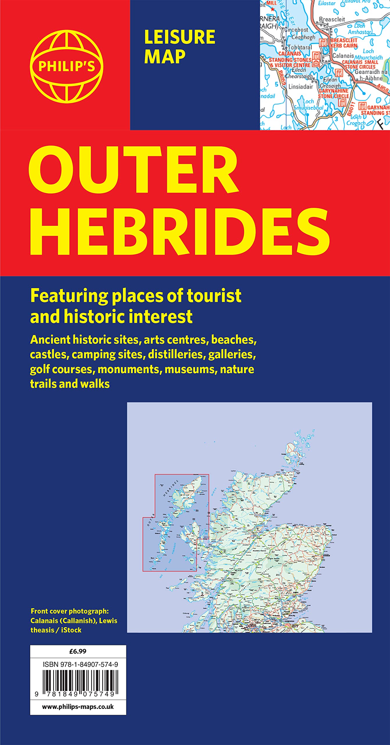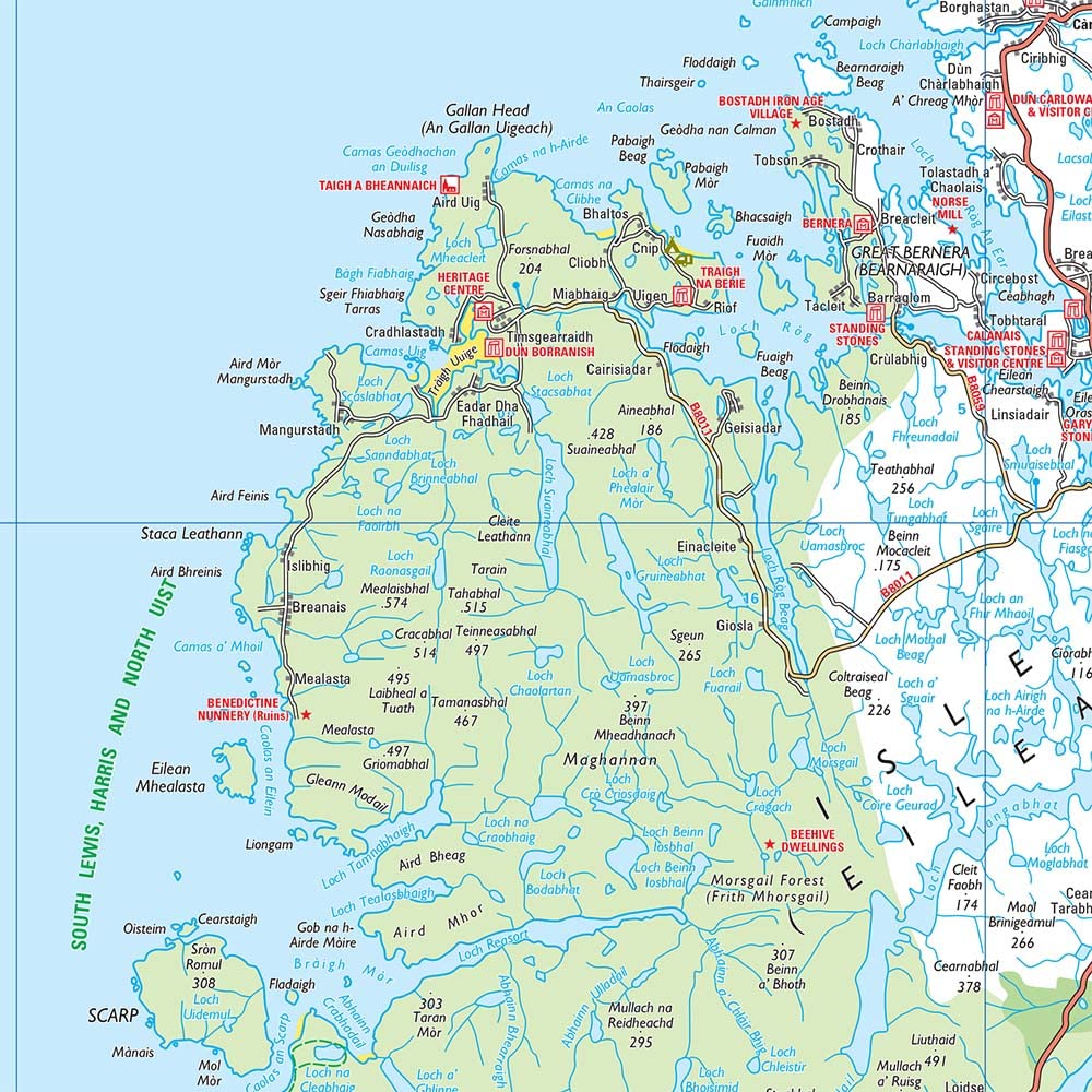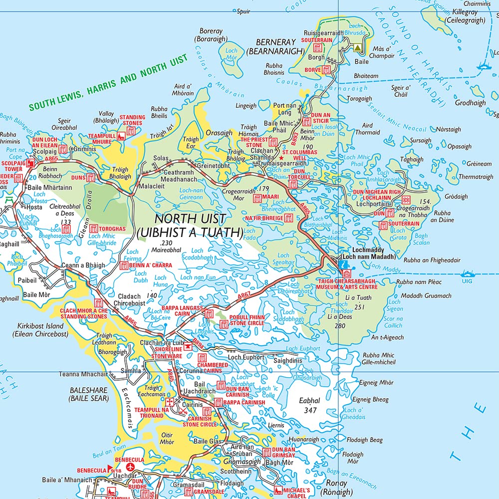 The new edition of this leisure and tourist map of the Outer Hebrides gives detailed coverage of the area's road network at a scale of 3.16 miles to 1 inc or 1:100.000 in kilometers