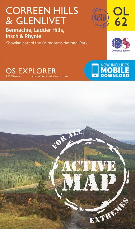 Map sheet OL 62 covers Correen Hills and Glenlivet. Highlights include Cairngorms National Park, Gordon Way and Badingair Hill. Also includes Water of Bogie, Rhynie, Insch and Bennachie. This was formerly Explorer sheet 420