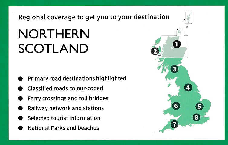 Een serie uitstekende wegenkaarten van Ordnance survey, de topografische dienst van Engeland. Alle 8 delen kennen een schaal van 1:250.000. Het kleurgebruik is uitbundig maar niet storend; integendeel, de hoogtes worden meteen duidelijk. De klassificatie van de wegen is behoorlijk uitgebreid, spoorlijnen, veerdiensten staan er op vermeld en met symbolen worden de toeristische bezienswaardigheden aangeven, maar ook bijvoorbeeld wandeltrails en campings. Bij dat laatste is handig om te weten dat als er alleen een symbooltje staat van een tent dit ook meestal echt een kleinere camping is in tegenstelling tot een symbool waar ook de caravan wordt weergegeven. Een klein register is er op gedrukt.