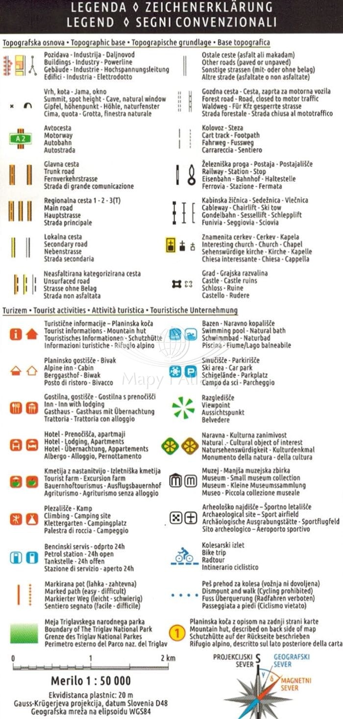 Julische Alpen wandelkaart door Kartografija op een schaal van 1: 50.000. De kaart bevat GPS-coördinaten en is gedrukt op waterbestendig papier. De achterkant bestaat uit een toeristische gids met beschrijvingen van toeristische bezienswaardigheden en berghutten, met foto's. Deze kaart bevat alle informatie over bergwegen, toegangen, attracties en bergchalets.