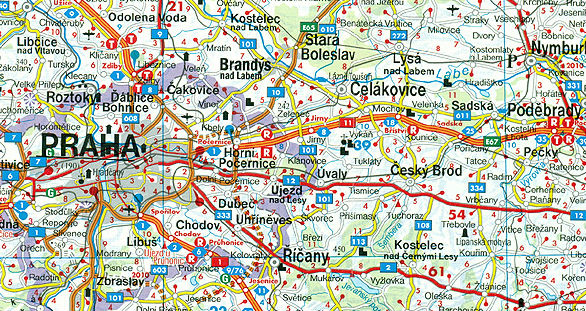 Gedetailleerde, tweezijdige landkaart van Tsjechie, prima geschikt voor planning en rondtrekken. De berijdbare wegen zijn goed weergeven, zowel de hoofdwegen als provinciale en lokale wegen; wegnummers worden vermeld. Afstanden tussen plaatsen zijn in kilometers op de kaart ingetekend, daarnaast worden ook op belangrijke plekken benzinepompen gemarkeerd.