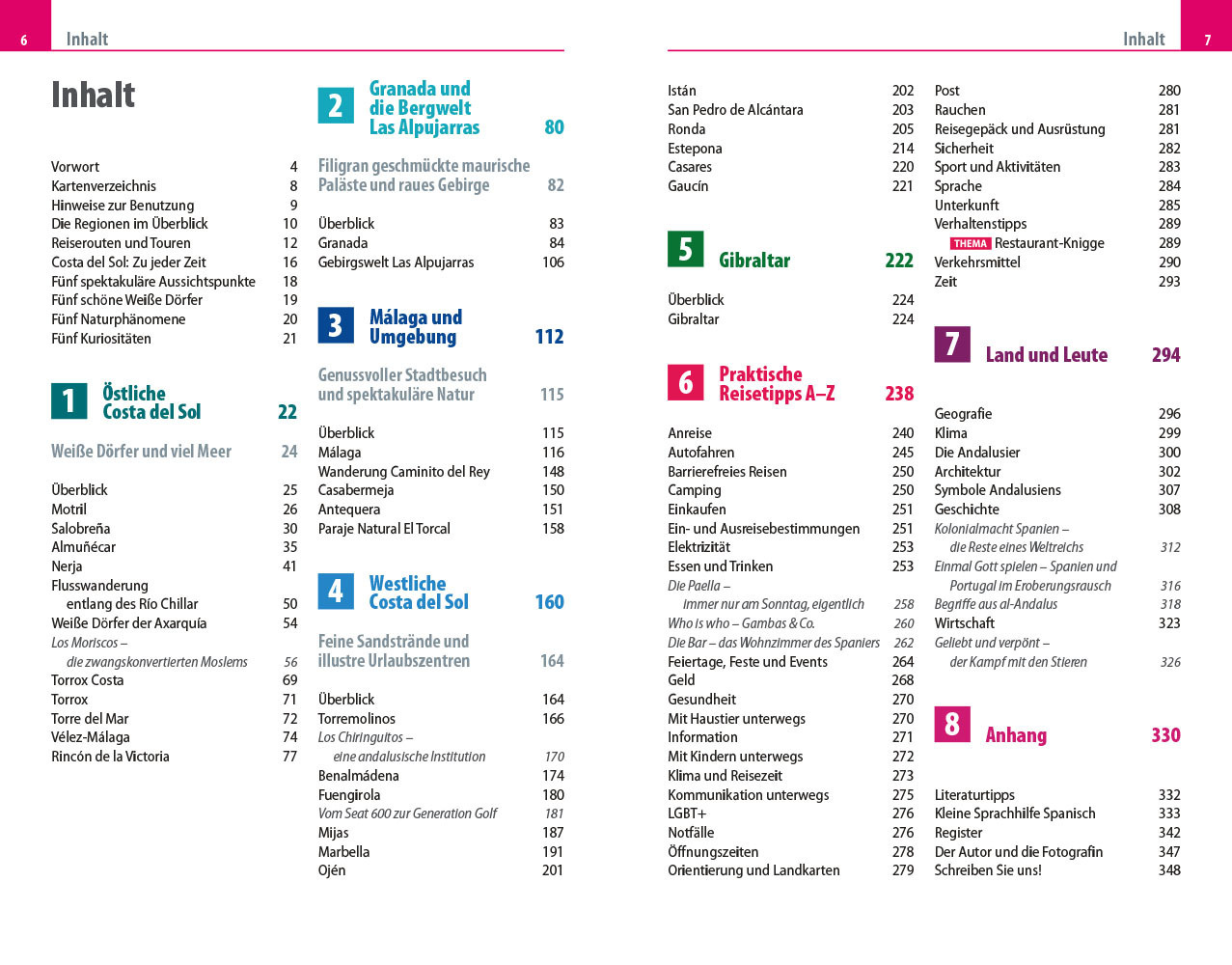 Jedes Kapitel beginnt mit einer Doppelseite, auf der die Inhalte mit Highlights und Seitenverweisen vorgestellt werden. Im Vorspann finden sich Übersichtsseiten mit Beschreibungen aller Regionen, eine Jahresübersicht zu Festen und Veranstaltungen, Routenvorschläge und persönliche Top-Tipps des Autors. Viele spezielle Infos, beispielsweise zur Anreise und zu den vielfältigen Möglichkeiten an Aktivitäten, sind hilfreiche Planungshelfer. Selbstfahrer finden ebenso wie Reisende, die mit öffentlichen Verkehrsmitteln unterwegs sind, alle notwendigen Informationen. Tipps zu naturnahem und nachhaltigem Reisen sowie zum Reisen mit Kindern helfen bei der Auswahl der passenden Adressen. Eine kleine Sprachhilfe Spanisch erleichtert die Konversation vor Ort.