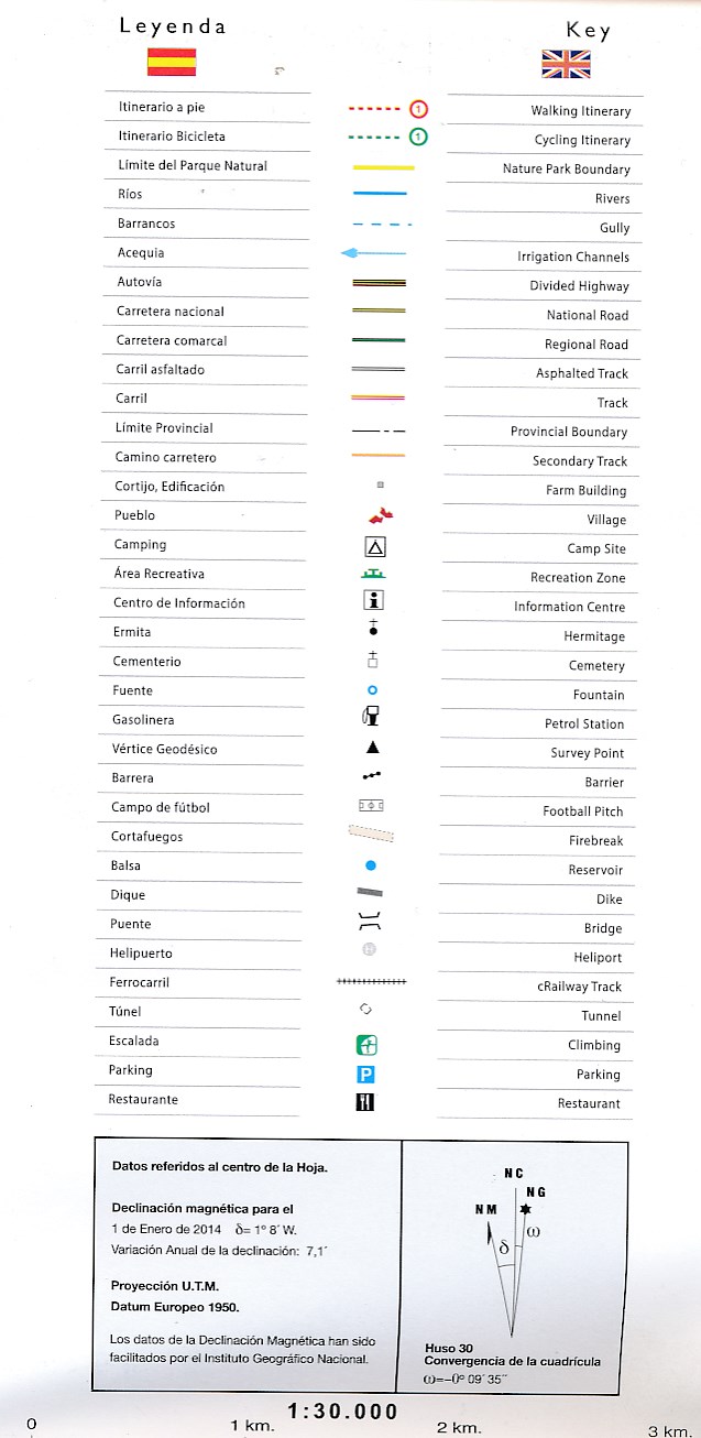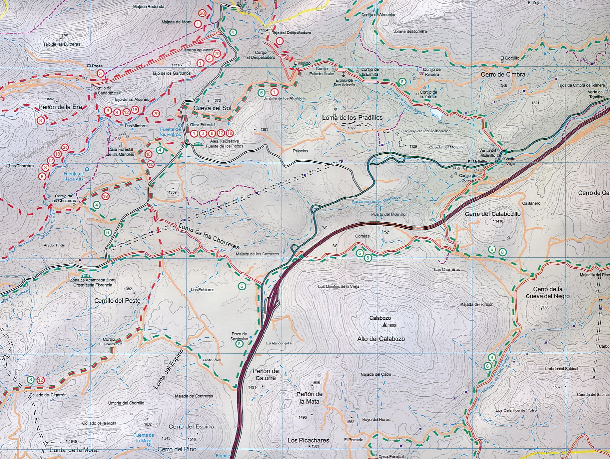 Topografische kaart met ingetekende rondwandelingen en fietsroutes. Een aantal van de routes wordt beschreven in het bijbehorende spaanstalige boekje. Het is een gebied net ten noordoosten van Granada.