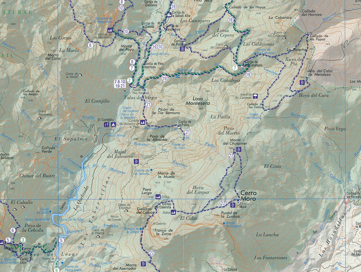 Goede wandelkaart met hoogtelijnen en ingetekende wandelroutes van het Parque Natural Sierra de Castril in het zuidoosten van Spanje.