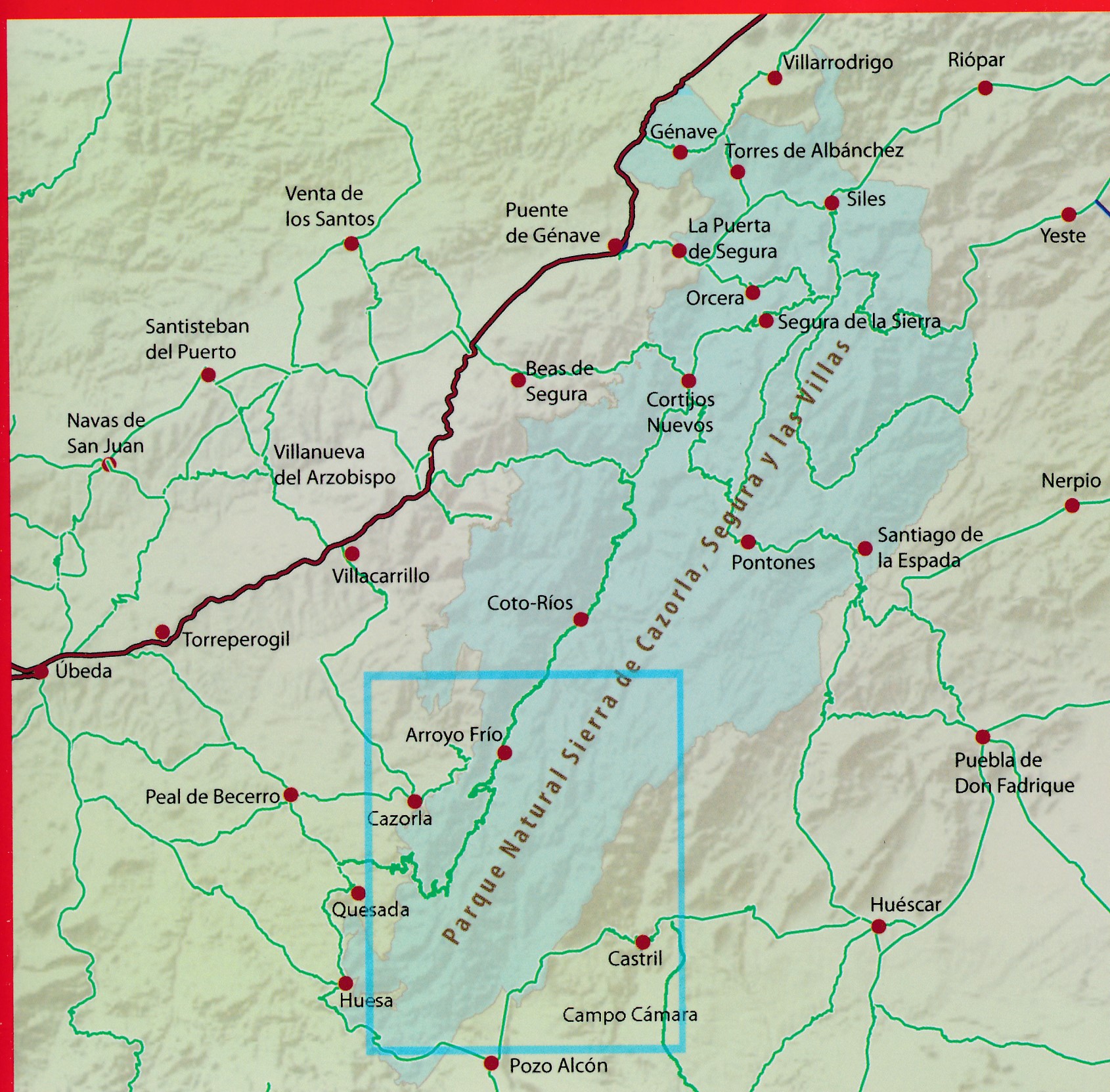 Een zeer uitgebreide wandelkaart van het Parque Natural Sierra de Cazorla, Segura y las Villas met een Spaans / Engels gidsje met een aantal beschreven wandelroutes met een lengte tussen de 1 km en 15 km. Op de kaart worden hoogtelijnen, plaatselijke voorzieningen, wandelroutes en andere outdooractiviteiten meegenomen. GPS compatible.