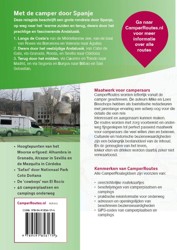 MET DE CAMPER DOOR SPANJE De grote rondreis door ANDALUSIË en terug Deze praktische reisgids bevat informatie op maat voor een individuele reis door het fascinerende Andalusië met zijn ruige natuur en Moorse cultuurmonumenten, inclesief de heen- en terugreis over twee prachtige routes. Het auteursechtpaar Mike en Loes Bisschops, met 30 jaar ervaring in de reisjournalistiek, neemt je mee op een boeiende zwerftocht door het authentieke binnenland van Spanje, langs zonnige kusten, Moorse paleizen, witte dorpen en onbedorven berggebieden. Praktische zaken als ‘waar overnachten we en waar kunnen we lekker (en voordelig) eten?’ komen uitgebreid aan de orde. DE ROUTE IN ’T KORT De heenreis wordt beschreven van noord naar zuid, langs de kust van de Middellandse Zee. Barcelona en València krijgen ruim aandacht, evenals Denia en de exotische palmentuin van Elche. De reis door Andalusië begint in het Nationale Park Cabo de Gata, en voert langs het Alhambra in Granada, de gespleten stad Ronda en de Witte Dorpenroute naar Sevilla en Córdoba. Onderweg komt het natuurgebied van de Coto de Doñana in beeld, evenals het bedevaartstadje El Rocío. De terugweg naar het noorden loopt eerst door Extremadura, langs Murcia en Cáceres, vervolgens met een wijde bocht naar Toledo en Madrid en tenslotte door Castilië via Segovia en Burgos naar Baskenland. De route eindigt ,via het Guggenheim Museum in Bilbao, aan de prachtige baai van San Sebastian. Elk hoofdstuk wordt voorafgegaan door een overzicht van de route, met vermelding van de hoogtepunten onderweg en de overnachtingsmogelijkheden op camperplaatsen en campings. MAATWERK VOOR EEN BOEIENDE CAMPERREIS CamperRoutes worden letterlijk vanuit de camper geschreven. De auteurs, Mike en Loes Bisschops, hebben als toeristische redacteuren met jarenlange ervaring een scherp oog voor de details die een reis interessant en aangenaam kunnen maken. De routes worden met zorg voorbereid en onderweg fijn geslepen tot perfect passend maatwerk voor camperaars die veel willen zien en beleven. KENMERKEN VAN CAMPERROUTES Alle CamperRoutegidsen zijn voorzien van: *Overzichtelijke routekaartjes *Beschrijvingen van camperplaatsen en campings *Praktische informatie voor onderweg, met aandacht voor eten en drinken *Adressen en openingstijden en prijsindicaties van beschreven bezienswaardigheden *GPS-codes van camperplaatsen en campings. De 8e druk van deze uitgave in de reeks CamperRoutes is uitgebreid met o.a. stadswandelingen in Cáceres en Segovia en een spectaculaire wandeling langs de steile rotswanden van de Caminito del Rey in de omgeving van Malaga. 176 pagina’s met sfeervolle en praktische tekst, goede reisinformatie, routekaartjes, recensies van campings en camperplaatsen en honderden fraaie en verhelderende illustraties.