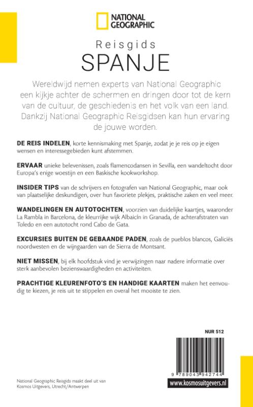 National Geographic Reisgids Spanje is een exclusieve gids met sublieme fotografie die u meeneemt naar de bekende en minder bekende bezienswaardigheden. De experts van National Geographic nemen een kijkje achter de schermen en dringen door tot de kern van de cultuur, de geschiedenis en bijzondere plekjes van het land. Bezoek met deze National Geographic Reisgids Spanje de pueblos blancos, Galiciës noordwesten en de wijngaarden van de Sierra de Montsant. Ga flamenco dansen in Sevilla, maak een wandeltocht door Europa's enige woestijn en volg een Baskische kookworkshop. maak een wandeling over La Rambla in Barcelona, door de kleurrijke wijk Albaicín in Granada en door de achterafstraten van Toledo. De uitgebreide kennismaking met Spanje, het overzicht met belevenissen die je niet mag missen, de insider tips, de excursies buiten de gebaande paden en de reiswijzer met hotels en restaurants en de handige kaarten maken de gids compleet. Speciaal aanbevolen voor natuur- en cultuurliefhebbers!