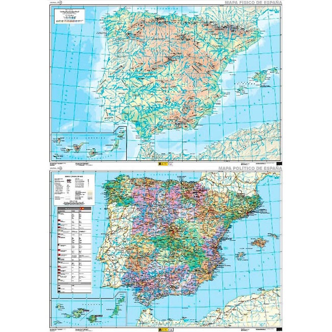 Tweezijdig bedrukte wandkaart met aan de ene kant de fysieke kaart van Spanje en aan de andere kant de politieke kaart van Spanje.
