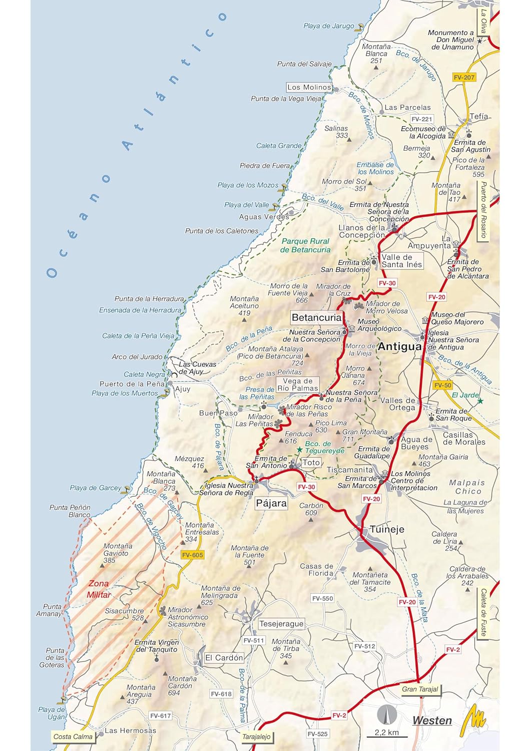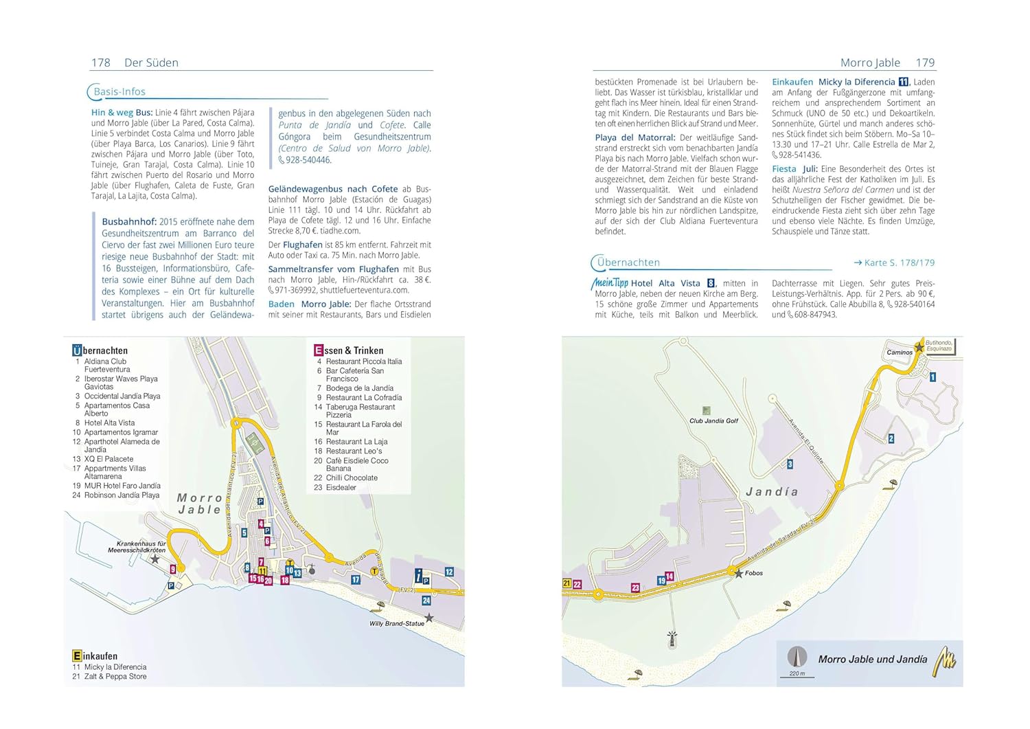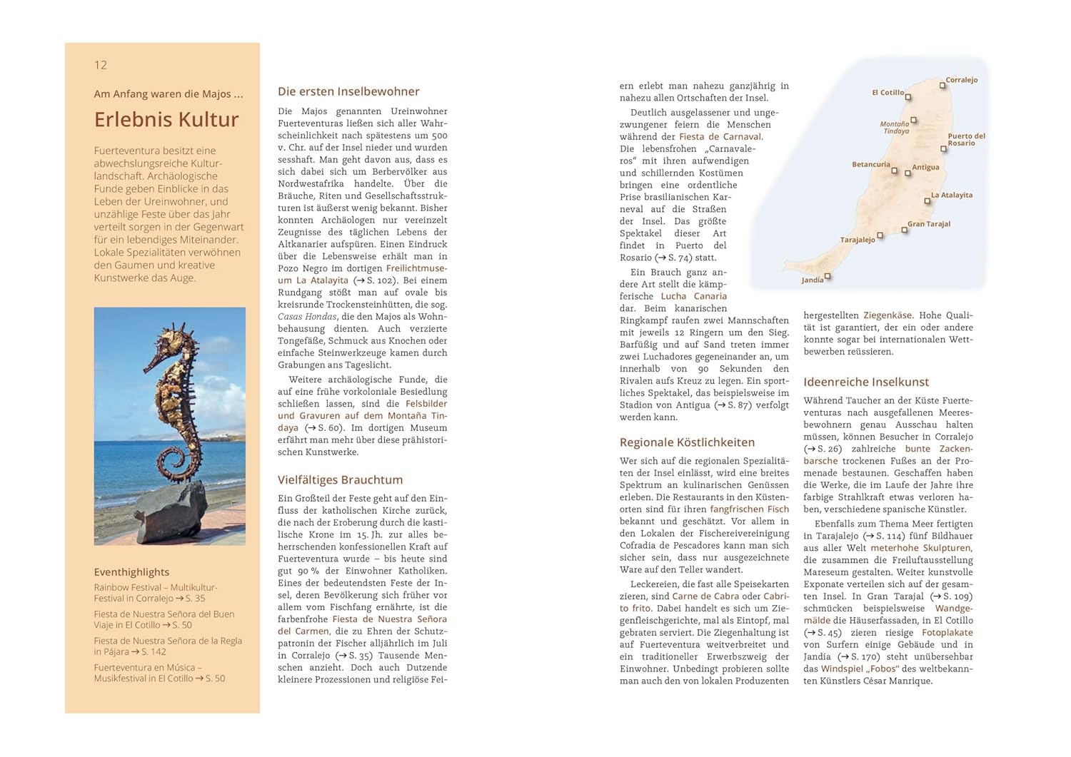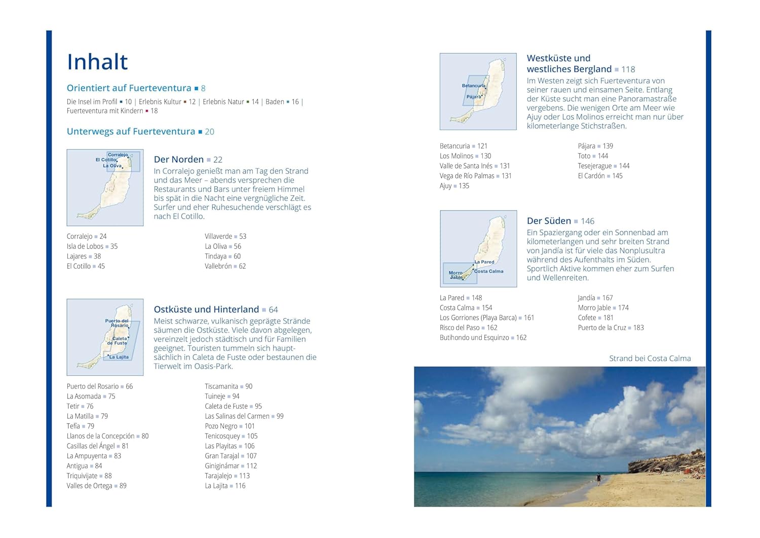 Die Insel im Detail – 168 Seiten mit allen wichtigen und interessanten Orten und allen von Fuerteventuras Sehenswürdigkeiten: Der Inselnorden mit Corralejo, El Cotillo, Lajares, La Oliva, Villaverde, Tindaya, dem Naturpark Dunas de Corralejo und der Isla de Lobos.Die Ostküste und das Hinterland der Insel mit Puerto del Rosario, Tafia, Triquivijate, Antigua, Caleta de Fuste, Tuineje, La Atalayita, Las Playitas, Oasis Park, Gran Tarajal, Tarajalejo und La Lajita.