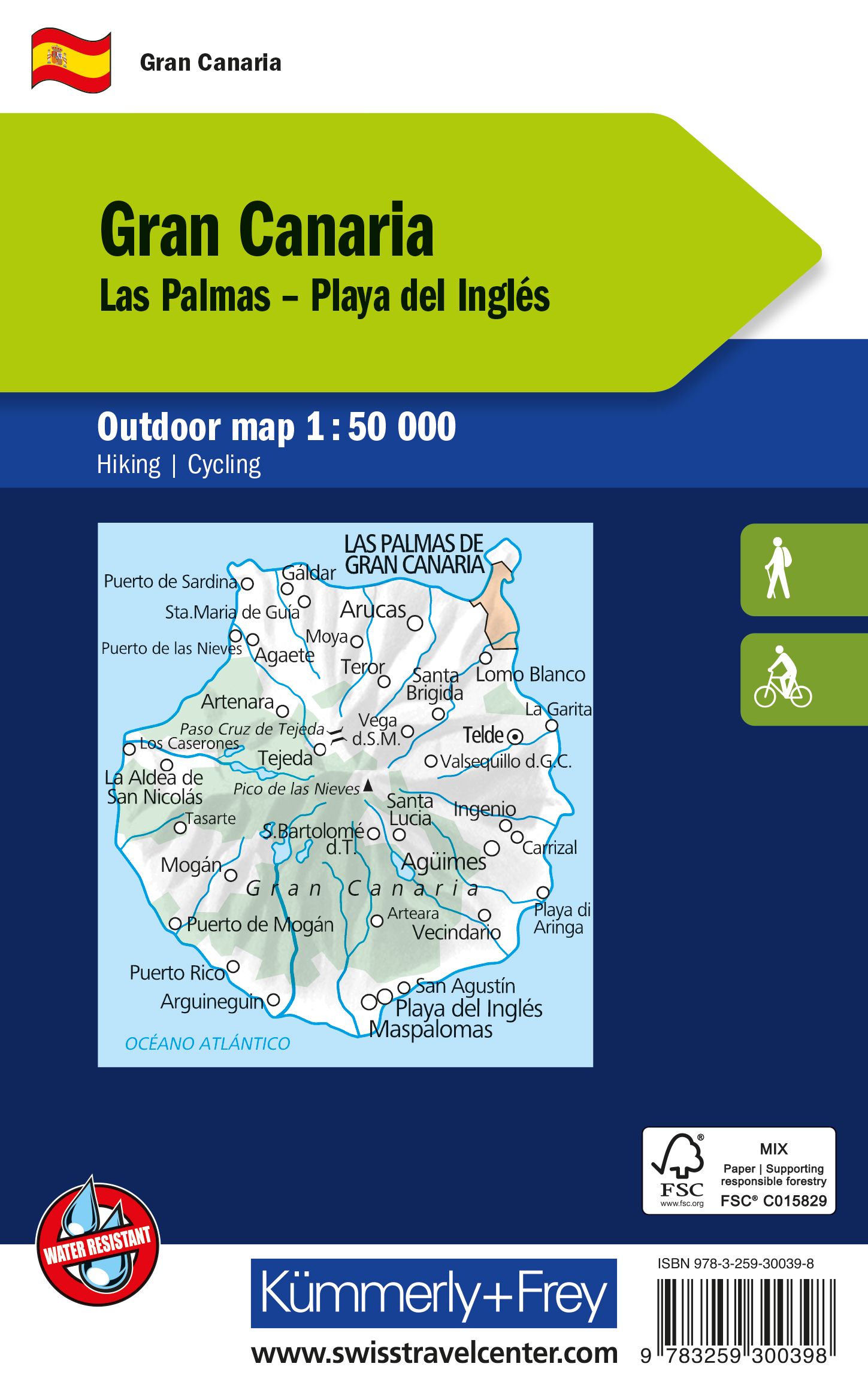 De Outdoorkarte Gran Canaria van Kümmerly & Frey (schaal 1:50.000) is de perfecte kaart voor iedereen die het eiland actief wil ontdekken. Van Arucas tot Playa del Inglés staan alle belangrijke wandelroutes, fietspaden en recreatiemogelijkheden helder en overzichtelijk weergegeven. Dankzij de duidelijke cartografie, nauwkeurige terreinweergave en de mogelijkheid om de digitale versie te downloaden via de HKF Outdoor App, haal je het maximale uit je trip op Gran Canaria.