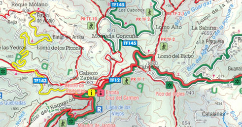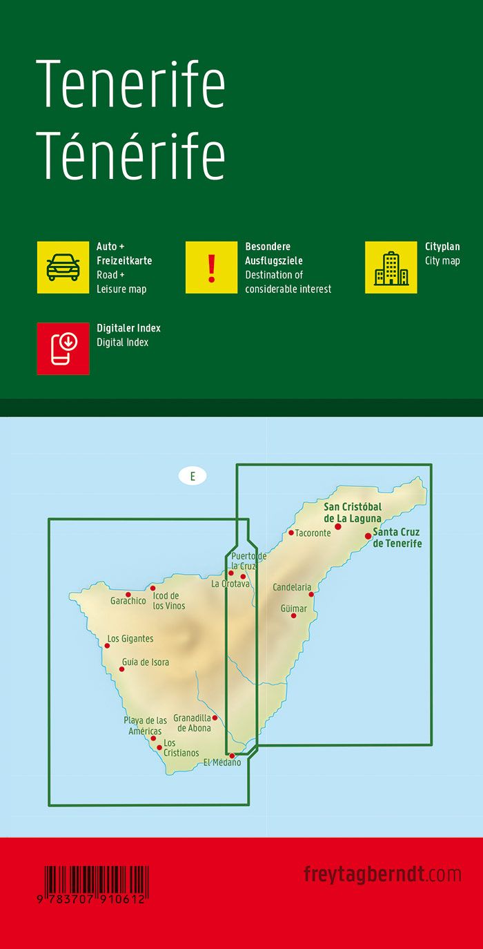 Goede wandelkaart van Tenerife, gedetailleerde toeristenkaart met veel extra informatie zoals groene wegen en mooiste wandelgebieden aangegeven, uitgebreide legenda en plaatsnamenregister