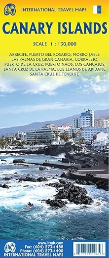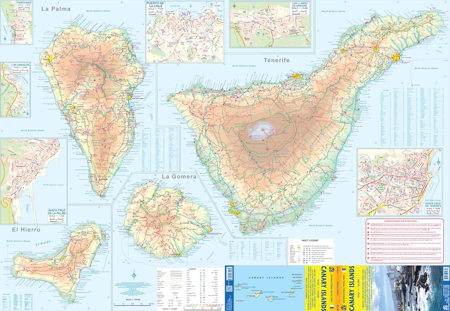 The Canaries are one of the largest travel destinations in the world; ideal for soaking up sunshine, engaging in water activities, or exploring. All the islands have been included on this map, as well as the ferry routes connecting. Naturally, airports, roads, major resorts, towns, beaches, parks, hiking trails, and touristic attractions are included. Each island is shown at the same scale and with the same attention to detail. As well, several inset maps of urban areas has been included, such as Santa Cruz de la Palma, Cancajos, Los Llanos de Aridane and Puerto Naos on La Palma, Santa Cruz on Tenerife, Las Palmas on Gran Canaria, Corralejo on Fuerteventura, Arricife on Lanzarote, and a couple of other towns. This is an excellent travel friendly map, easy to read and to use.