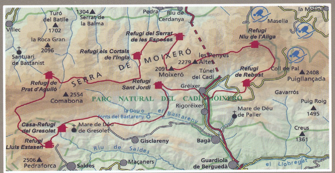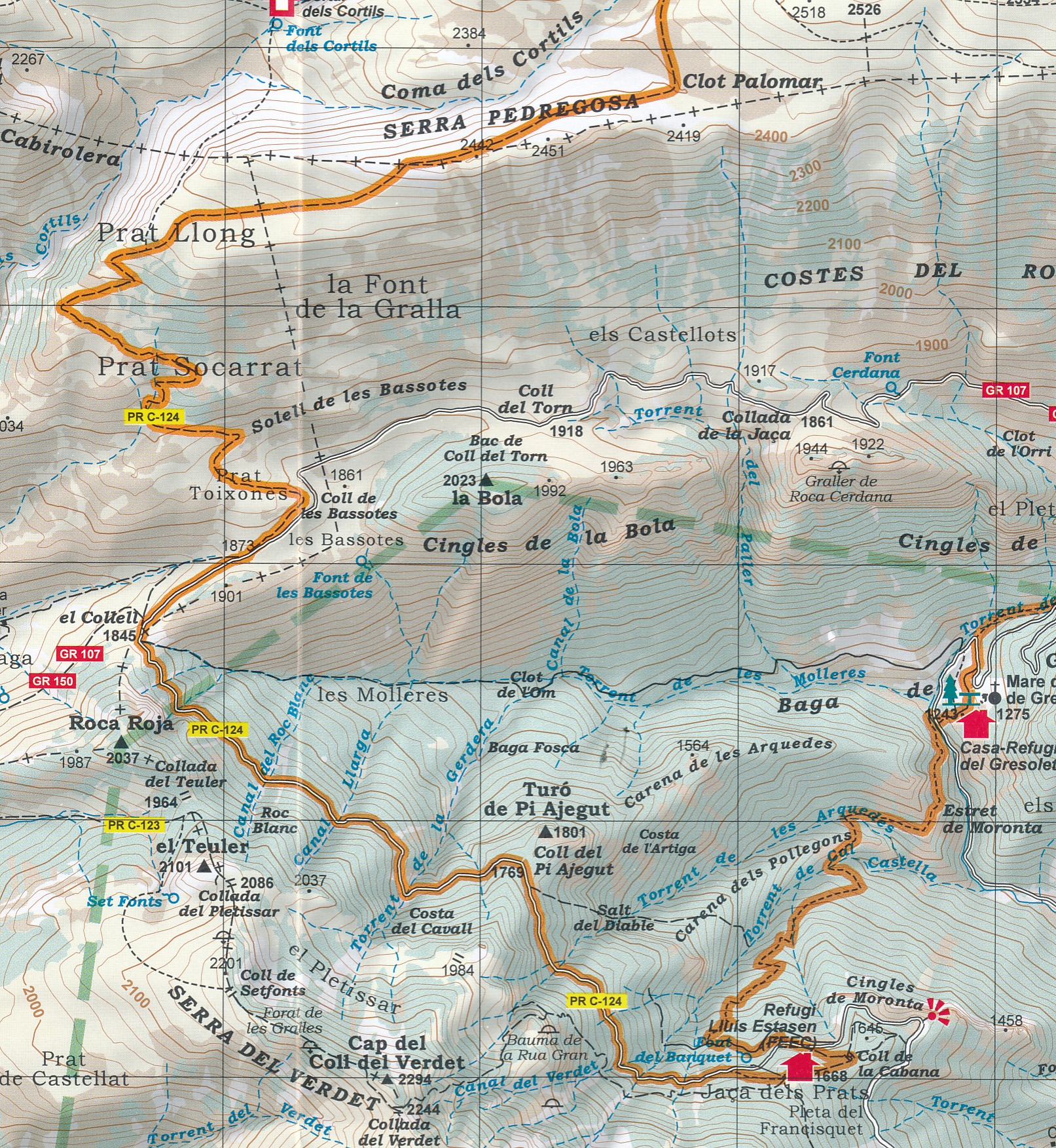 Gedetailleerde wandelkaart van een meerdaagse tocht in de Spaanse Pyreneeen, veel detail op topografisch niveau met hoogtelijnen, schaduwwerking, hutten, paden etc. Coördinaten zijn weergegeven, dus GPS compatible met UTM grid.