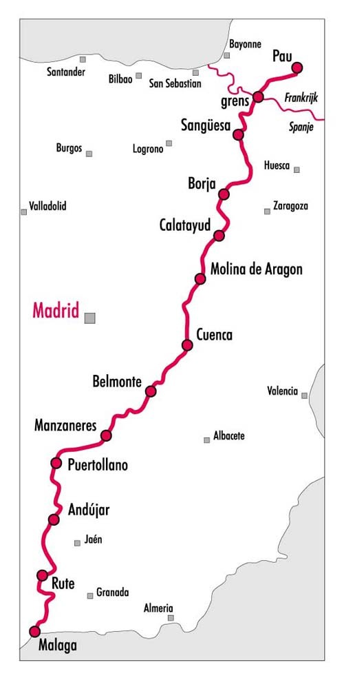 U begint in de havenstad Málaga vanwaar u Andalusië binnentrekt. Het is het land van zigeuners, Arabieren en olijven. Direct voorbij het stadje Andújar aan de Guadalquivir trekt u de Sierra Morena over, een niet zo hoog maar wel uitgestrekt en verlaten berggebied. Aan de overkant ligt Castillia-La Mancha, het hart van Spanje. Hier passeert u het land van Calatrava, de vlakte van Don Quijote met de vermaarde molens, de oude stad Cuenca en tenslotte de ruige natuur van het ´Parque Natural del Alto Tajo´. Daarna komt u in het voormalige koninkrijk Aragón. Hier ligt de door de Moren gestichte stad Calatayud, de Ebro-vlakte en het pelgrimsoord Sangüesa.