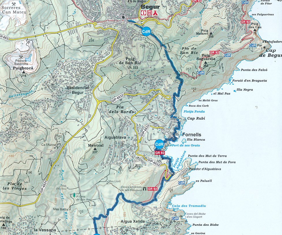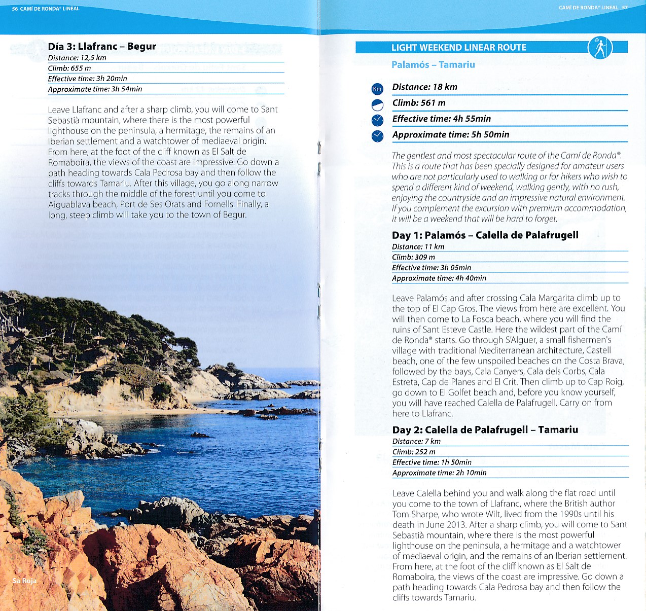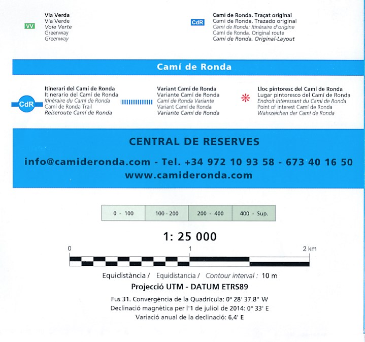 Goede gedetaileerde wandelkaart van het hele gebied waarover de Cami de Ronda loopt, een deel van de Costa Brava. Naast de ingetekende route wordt op de kaart duidelijk waar bjivoorbeeld campings zijn. Veel detail op de kaart, schaal 1:25.000.