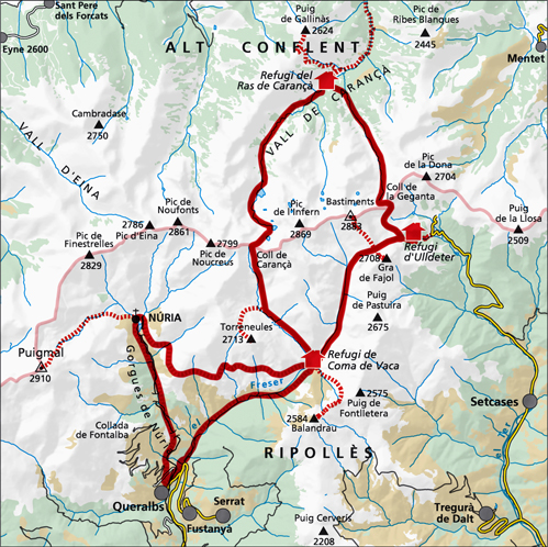 Zeer gedetailleerde wandelkaart van een klein deel van de Spaanse Pyreneeen / Catalonie. Met ingetekende wandelroutes en andere informatie. Spaanstalig, maar uitstekende kaart. Met symbolen voor campings, hutten.