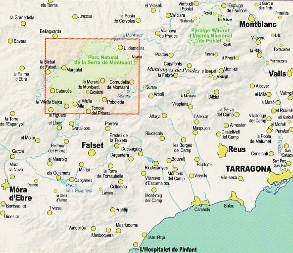 De laatste editie van de topografische kaart van de Serra de Montsant schaal 1: 20.000 heeft de volgende locaties: Ulldemolins, Margalef, de Vilella Alta Vilella Baja, Poboleda, Scala-Dei, de Morera de Montsant, Cornulleda de Montsant, la Bisbal falset, la Figuera, Priorat Torroja, Cabacés en Albarca.
