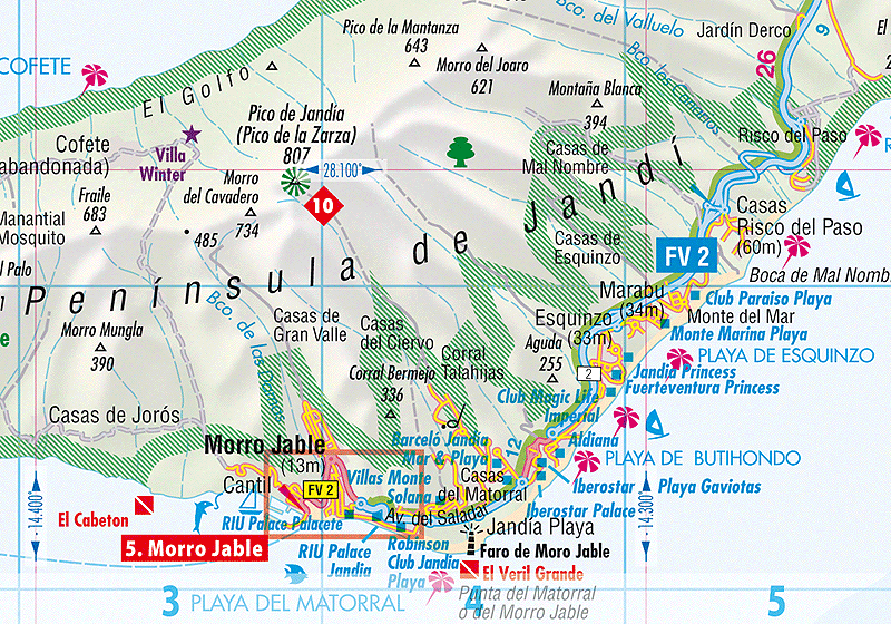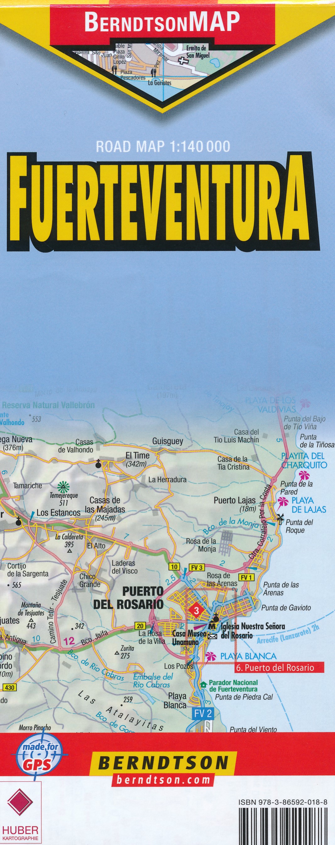 Geplastificeerde wegenkaart van Fuerteventura. Goede duidelijke kaart voor de toerist die rondreist met auto of vanuit vaste standplaats uitstapjes maakt. Het is geen wandelkaart.