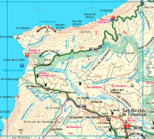 Handige, geplastificeerde kaart van het noordelijk deel van Gran Canaria. Fietsroutes, enkele MTB routes en wandelpaden zijn met verschillende kleuren ingetekend.