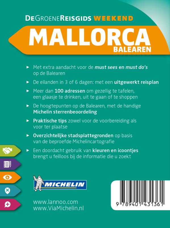 De 3-sterrengids voor een geslaagde citytrip - Met extra aandacht voor de must sees en must do's op de Balearen - De eilanden in 3 of 6 dagen: met een uitgewerkt reisplan - Meer dan 100 adressen om gezellig te tafelen, een glaasje te drinken, uit te gaan of te shoppen - De hoogtepunten op de Balearen, met de handige Michelin sterrenbeoordeling - Praktische tips zowel voor de voorbereiding als voor ter plaatse - Overzichtelijke stadsplattegronden op basis van de beproefde Michelincartografie - Een doordacht gebruik van kleuren en icoontjes brengt u feilloos bij de informatie die u zoekt