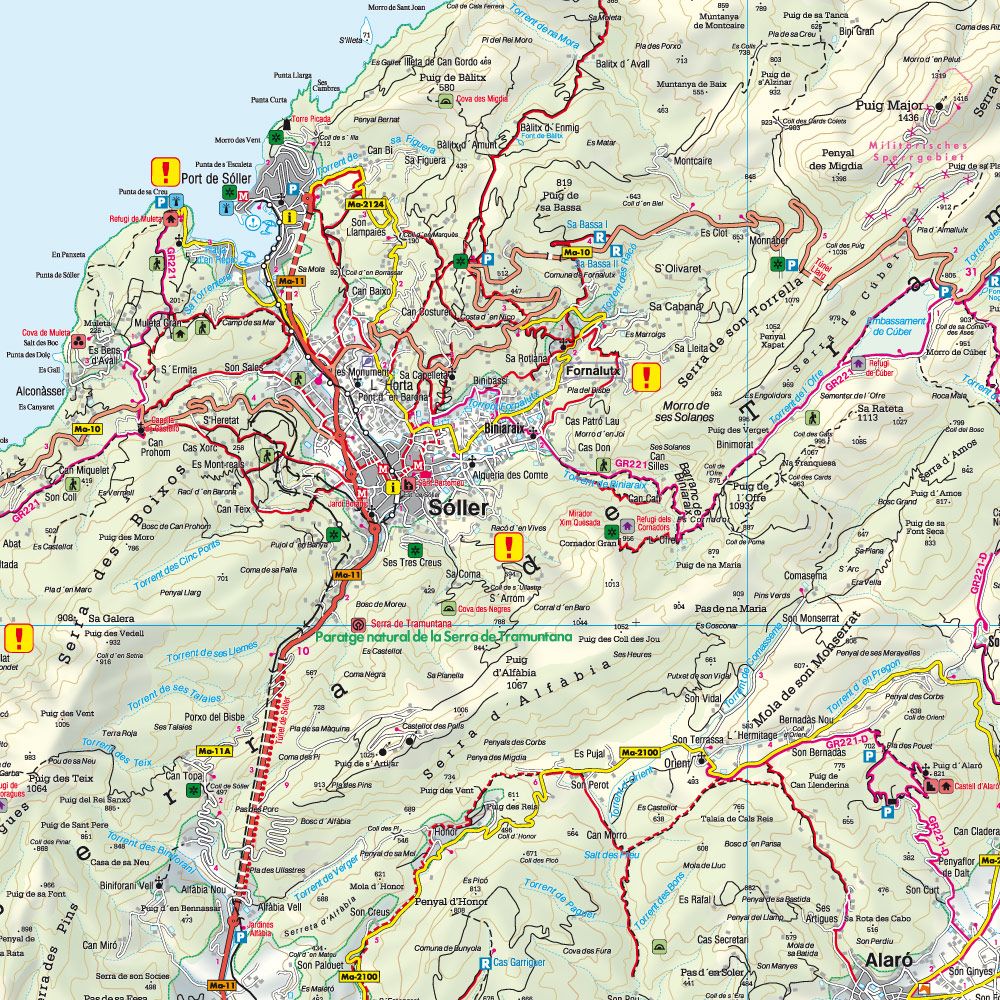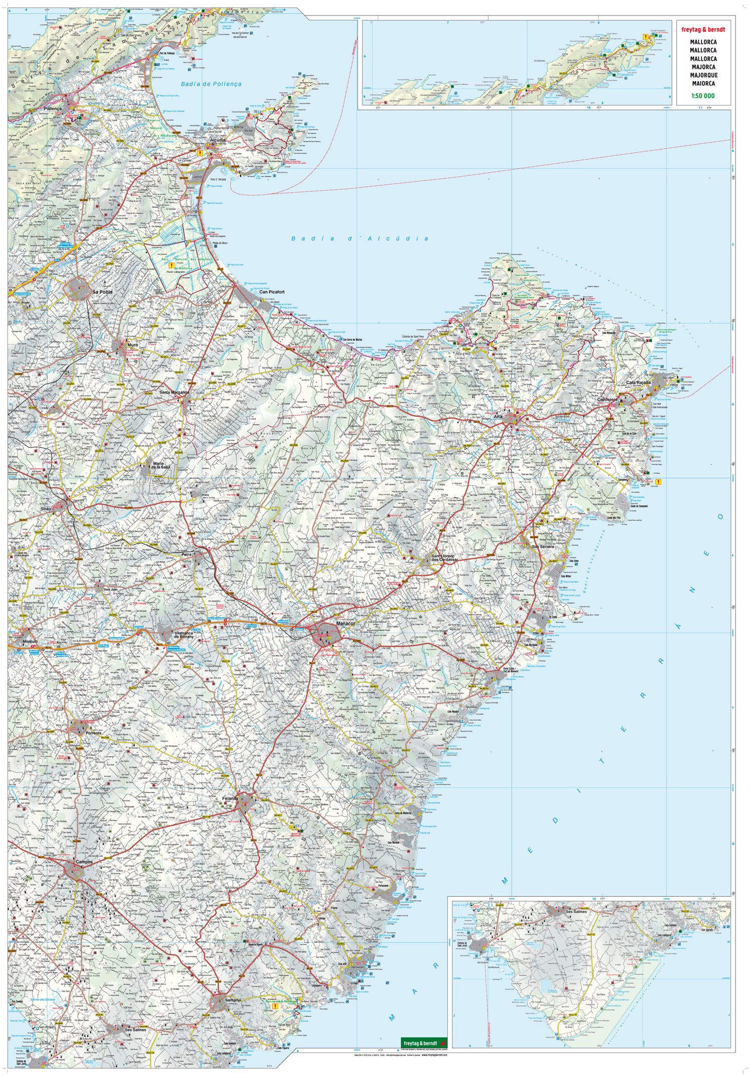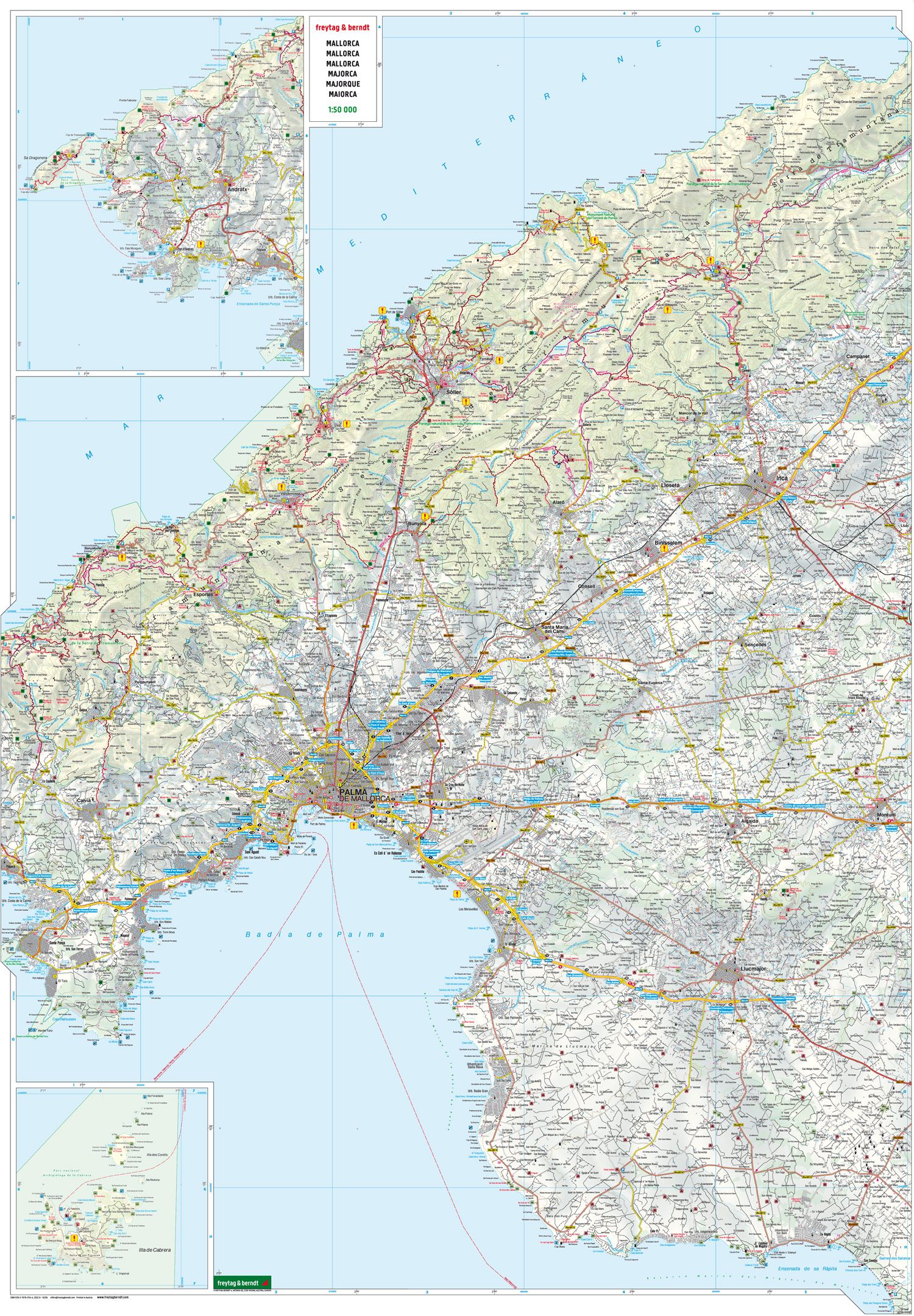 Uitstekende tweezijdige wegenkaart of fietskaart en redelijke wandelkaart van Mallorca met toeristische informatie, jachthavens, stranden, vele wandelpaden en ook de gemarkeerde paden. Alle bezienswaardigheden worden goed weergegeven. Met register