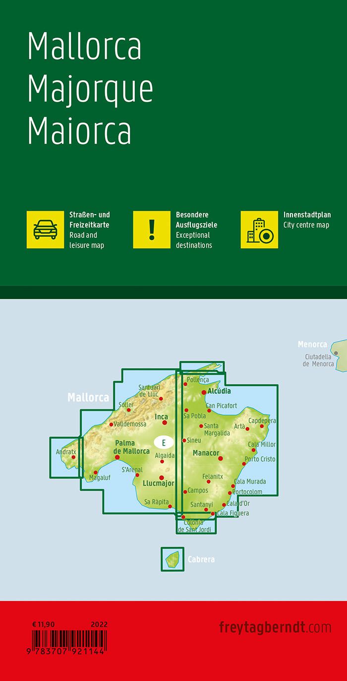 freytag & berndt Autokarten sind für viele Länder und Regionen weltweit erhältlich. Neben der übersichtlichen Gestaltung verfügen die Straßenkarten über zahlreiche Zusatzinformationen wie z.B. Straßenbeschaffenheit, Sehenswürdigkeiten, Campingplätze und diverse Innenstadtpläne. Mit dem umfangreichen Ortsregister gelingt zudem eine rasche Orientierung. Der beiliegende, mehrsprachige Freizeitführer bietet Informationen zu besonderen und sehenswerten Ausflugszielen der Insel. (Sprachen: Katalanisch, Spanisch, Deutsch, Englisch, Französisch, Italienisch). Achtung! Besondere Ausflugsziele, Cityplan Palma, Ortsregister mit GPS.