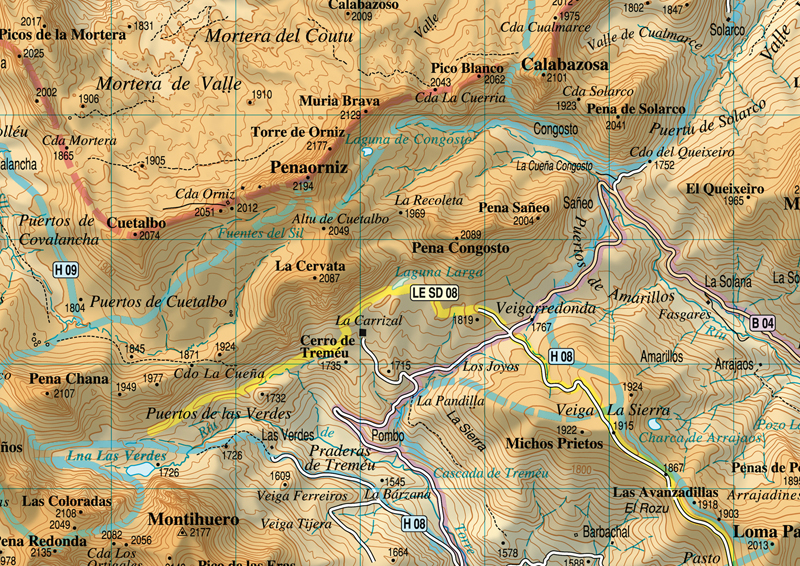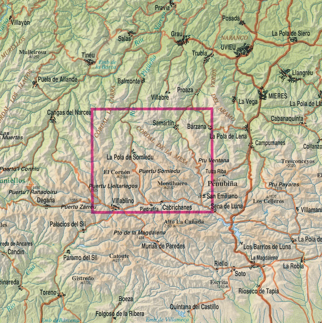 Uitstekende topografische wandelkaart met hoogtelijnen van een klein wandelgebied ten Zuid Westen van Oviedo. Op de kaart zijn zowel gemarkeerde als niet gemarkeerde wandelroutes aangegeven alsmede campings en berghutten.