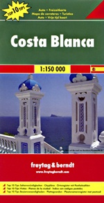 Explore Costa Blanca with this Freytag&Berndt road map. The best way to plan your trip, prepare your itinerary, and to travel independently in this part of Valencia region, in Spain. The legend is in 10 languages (English and Spanish included); touristic information; street maps of Murcia, Dénia, Alicante, Elche, and Benidorm.