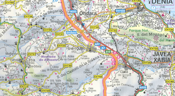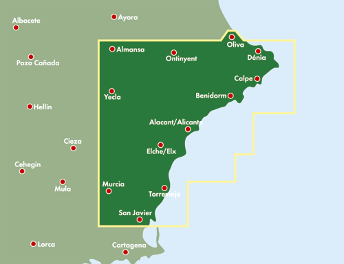 Gedetailleerde landkaart van de Costa Blanca, prima geschikt voor planning en rondtrekken. De berijdbare wegen zijn goed weergeven, zowel de hoofdwegen als provinciale en lokale wegen; wegnummers worden vermeld. Afstanden tussen plaatsen zijn in kilometers op de kaart ingetekend, daarnaast worden ook op belangrijke plekken benzinepompen gemarkeerd.