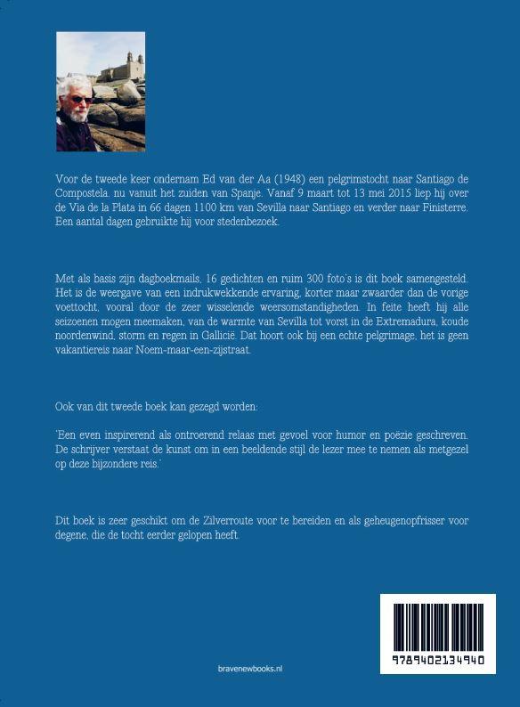 Voor de tweede keer ondernam Ed van der Aa (1948) een pelgrimstocht naar Santiago de Compostela, nu vanuit het zuiden van Spanje. Vanaf 9 maart tot 13 mei 2015 liep hij over de Via de la Plata in 66 dagen 1100 km van Sevilla naar Santiago en verder naar Finisterre. Een aantal dagen gebruikte hij voor stedenbezoek. Met als basis zijn dagboekmails, 16 gedichten en ruim 300 foto’s is dit boek samengesteld. Het is de weergave van een indrukwekkende ervaring, korter maar zwaarder dan de vorige voettocht, vooral door de zeer wisselende weersomstandigheden. In feite heeft hij alle seizoenen mogen meemaken, van de warmte van Sevilla tot vorst in de Extremadura, koude noordenwind, storm en regen in Gallicië. Dat hoort ook bij een echte pelgrimage, het is geen vakantiereis naar Noem-maar-een-zijstraat. Ook van dit tweede boek kan gezegd worden: ‘Een even inspirerend als ontroerend relaas met gevoel voor humor en poëzie geschreven. De schrijver verstaat de kunst om in een beeldende stijl de lezer mee te nemen als metgezel op deze bijzondere reis.’ Dit boek is zeer geschikt om de Zilverroute voor te bereiden en als geheugenopfrisser voor degene, die de tocht eerder gelopen heeft.