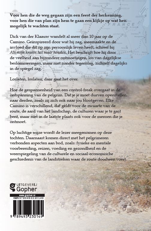 Voor hen die de weg gegaan zijn een feest der herkenning, voor hen die van plan zijn hem te gaan een kijkje op wat hen mogelijk te wachten staat. Dick van der Klaauw wandelt al meer dan 10 jaar op de Camino. Geïnspireerd door wat hij zag, meemaakte en de invloed die dit op zijn persoonlijk leven heeft, schreef hij Als mijn knieën het maar houden. Het beschrijft hoe hij door de veelheid aan bijzondere ontmoetingen, los van dagelijkse beslommeringen, maar niet zonder tegenslag, zichzelf dagelijks in de spiegel zag. Loslaten, loslaten, daar gaat het over. Hoe de gespannenheid van een control-freak overgaat in de ontspanning van de pelgrim. Dat je je moet durven openstellen naar derden, zoals zij zich ook naar jou blootgeven. Elke Camino is verschillend, dat geldt voor de zwaarte van de route, de aard van het landschap, de culturen waar je te gast bent, maar niet in de laatste plaats ook voor de mensen die je ontmoet. Op luchtige wijze wordt de lezer meegenomen op deze tochten. Daarnaast komen direct met het pelgrimeren verbonden aspecten aan bod, zoals: fysieke en mentale voorbereiding, reizen, voeding en gezondheid en de weerspiegeling van de culturele en sociaal-economische geschiedenis van de landstreken waar de route doorheen voert.