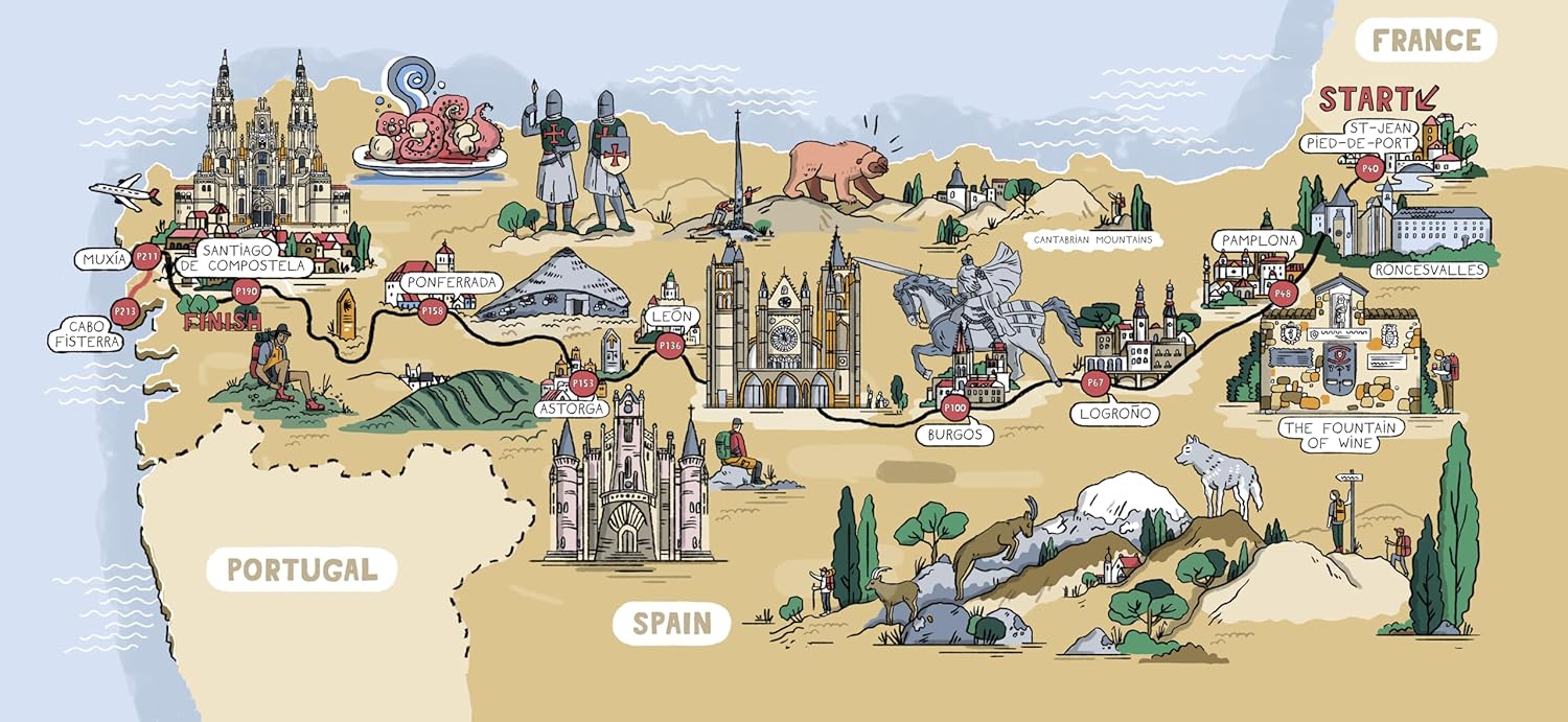 - Covers: Saint-Jean-Pied-de-Port; Pamplona; Logroño to Santo Domingo; Burgos to Carrión de Los Condes; León; Ponferrada; Sarria; Santiago de Compostela; Cabo Fisterra
