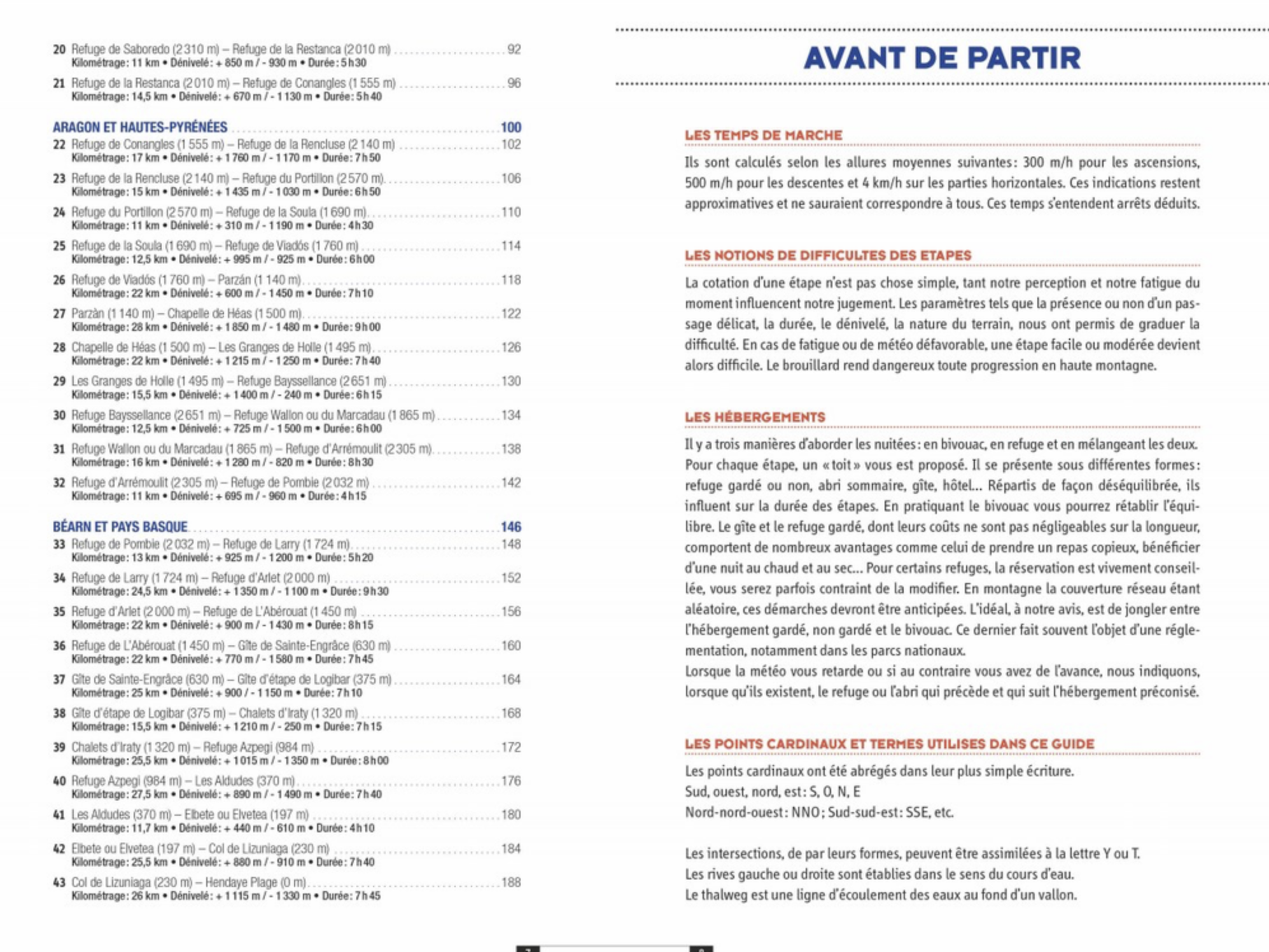Étapes (avec halte en refuge le plus souvent) comprises entre 4h30 et 9h00, avec des dénivelés positifs oscillant entre 300 et 1800 ( !) m. Quelques étapes réellement difficiles (15, 22, 27, 34).