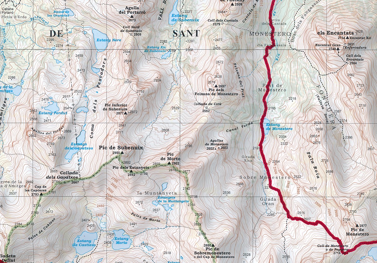 Bijzondere wandelkaart van een meerdaagse rondwandeling in een schitterend deel van de Pyreneeen. Op een zeer gedetailleerde schaal staat de route ingetekend, de kaartg zelf is van topografisch nivo met hoogtelijnen, relief- en schaduwwerking en hutten en campings.