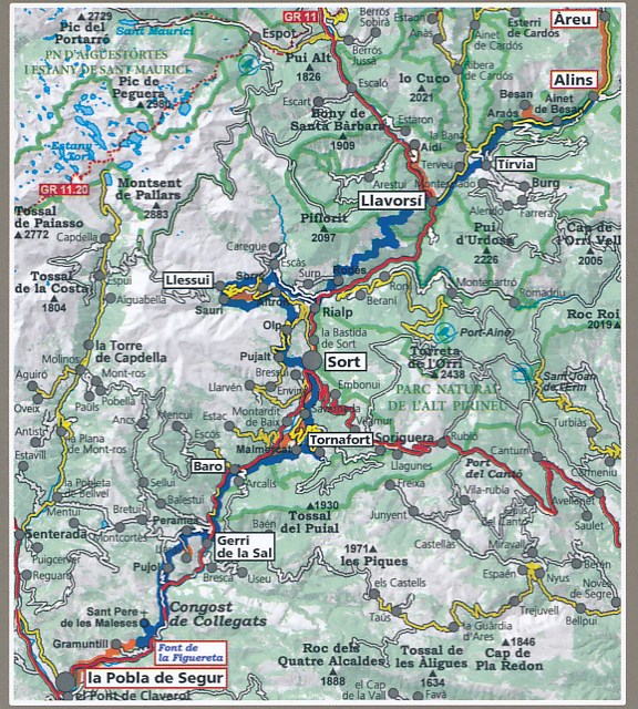Gedetailleerde wandelkaart van een meerdaagse tocht in de Spaanse Pyreneeen, veel detail op topografisch nivo met hoogtelijnen, schaduwwerking, hutten, paden etc.