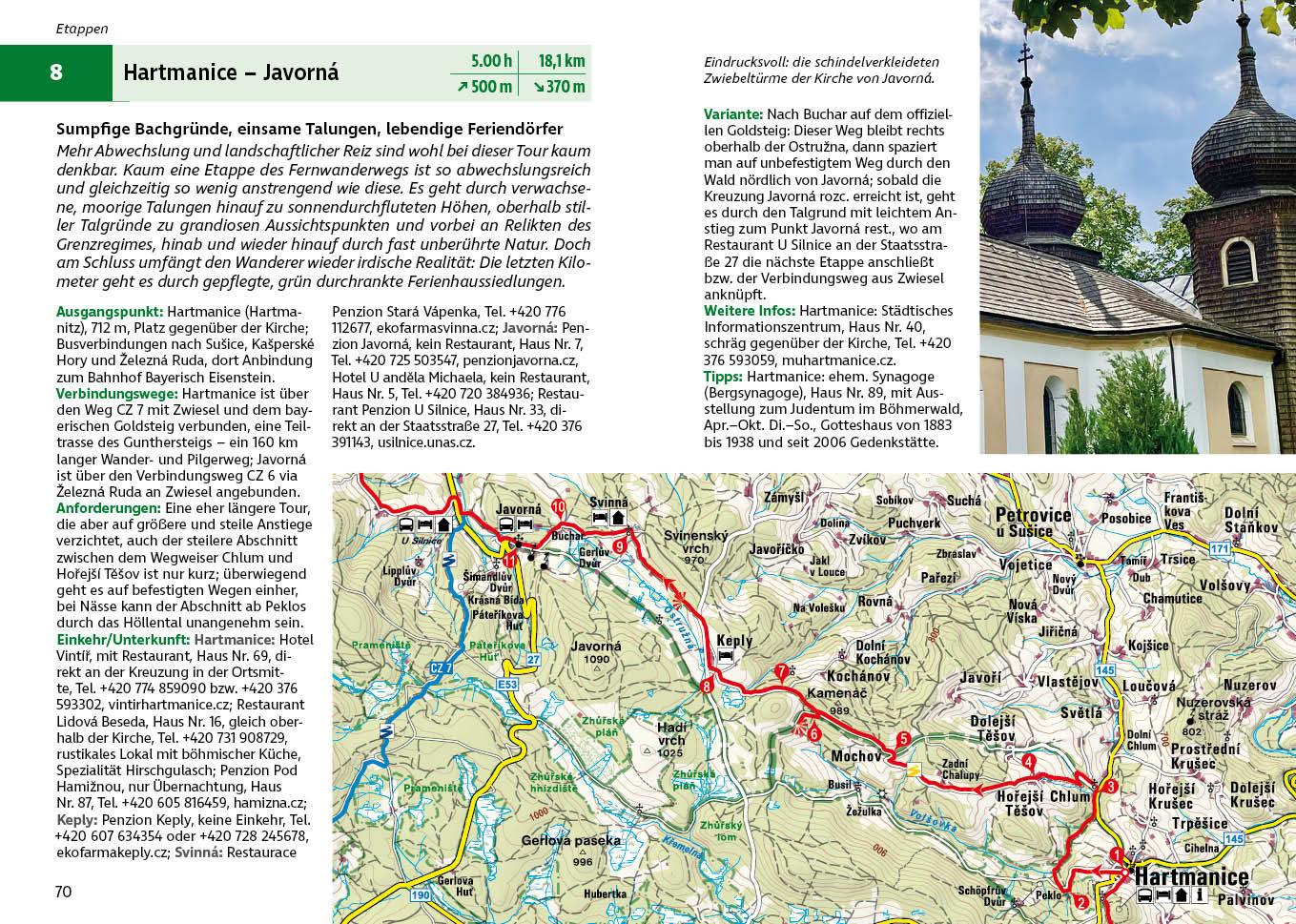 Der Rother Wanderführer »Tschechischer Goldsteig« liefert alle Informationen, die man als Weitwanderer benötigt. Er beschreibt zuverlässig alle Etappen sowie die Verbindungswege auf die bayerische Seite. So kann man den Weg beliebig auf die eigenen Bedürfnisse anpassen. Der Wanderführer liefert alle Infos zur Infrastruktur, wie Übernachtungsmöglichkeiten, Gastwirtschaften sowie Anbindung an Bus und Bahn. Für jede Etappe hält er Kartenausschnitte mit eingezeichnetem Wegverlauf sowie aussagekräftige Höhenprofile bereit. GPS-Tracks stehen zum Download bereit.