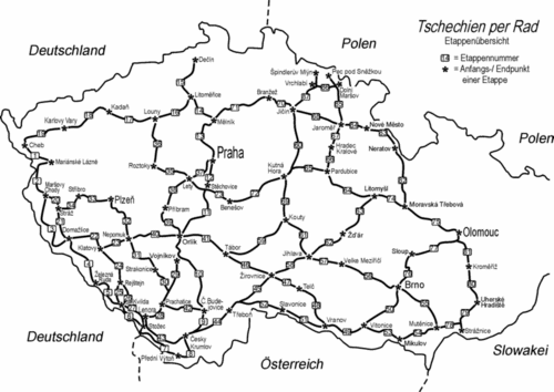 Das Etappennetz aus 87 Streckenvorschlägen deckt das gesamte Land ab. U.a. werden der komplette Böhmerwald-Radweg und eine Moldau-Route beschrieben.
