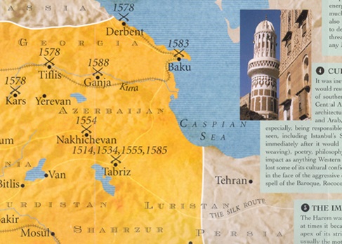 Historische landkaart van het Ottomaanse Rijk door New Holland Publishers. Het kaartbeeld geeft het Ottomaanse grondgebied weer onder het hoogtepunt van de Ottomaanse territoriale macht rond het jaar 1650. Het kaartbeeld wordt verrijkt met de plaatsen en jaartallen van belangrijke slagen en belegeringen. Het geheel wordt aangevuld met inzetten met belangrijke historische informatie en een tijdlijn. Hoewel het geheel cartografisch geen heel hoog detail weergeeft, maken de tijdlijn en de toegevoegde informatie het product tot een compact en overzichtelijke geschiedenis van het Ottomaanse Rijk tussen 1299 en 1923.