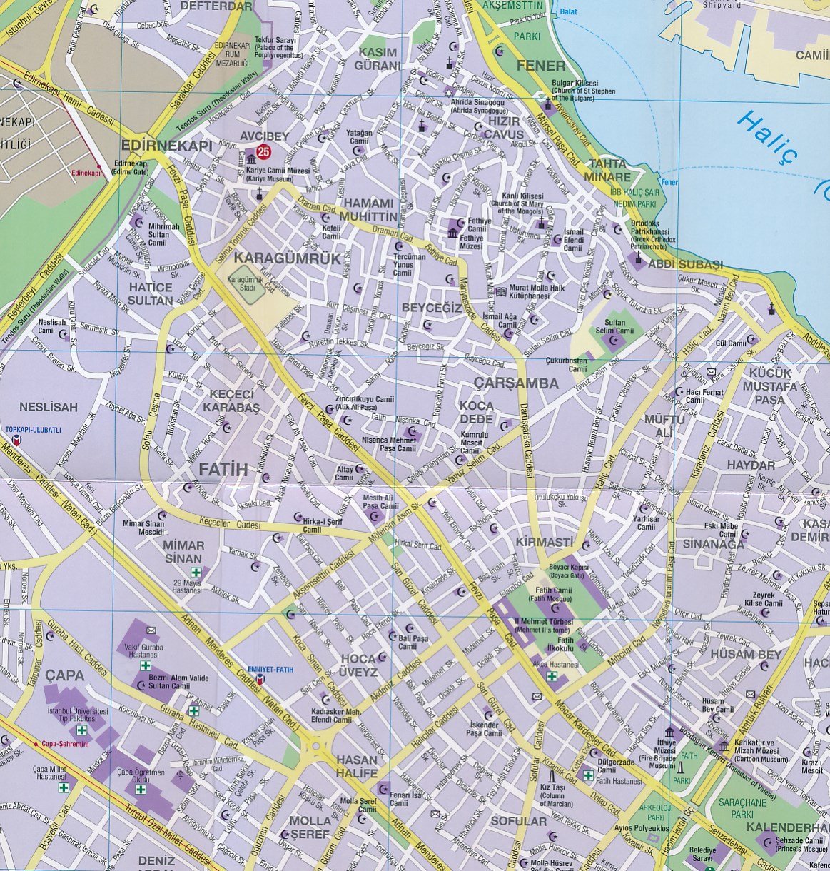 Geplastificeerde kaart van Istanbul, met register. Voor de 'gewone' toerist een handige kaart, geen groot formaat, overzichtelijk met alle belangrijke plaatsen goed weergegeven.