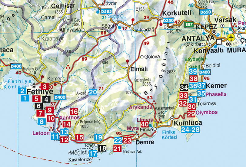 Viel Sonne und Strände ohne Ende sind nicht das Einzige, was die Türkische Riviera zu bieten hat. Das Hinterland der von Halbinseln, Kaps und den Ausläufern des Taurus geprägten buchtenreichen Küste darf ohne zu übertreiben eine der schönsten Wanderregionen am Mittelmeer genannt werden und hält Routen für alle Ansprüche bereit. Die Lykische Küste wurde seit 4000 Jahren von großen Kulturvölkern besiedelt, sie alle hinterließen mehr oder weniger gut sichtbare Spuren. Viele der archäologischen Stätten, so die Bergfestung Termessos, der Hafen Phaselis, die Hausgräber von Phellos oder das halb im Wasser versunkene antike Simena, sind in eine grandiose Berg- und Kulturlandschaft eingebettet. Dazu gesellen sich beeindruckende Naturwunder: die Schmetterlingsbucht bei Faralya, die Ewigen Flammen von Çirali, der gewaltige Canyon von Saklikent oder die bizarren Zedernwälder am Fuß des Olympos, der mit seinen gut 2300 m hoch über der Küste thront. Attraktive Wanderziele gibt es also mehr als genug.