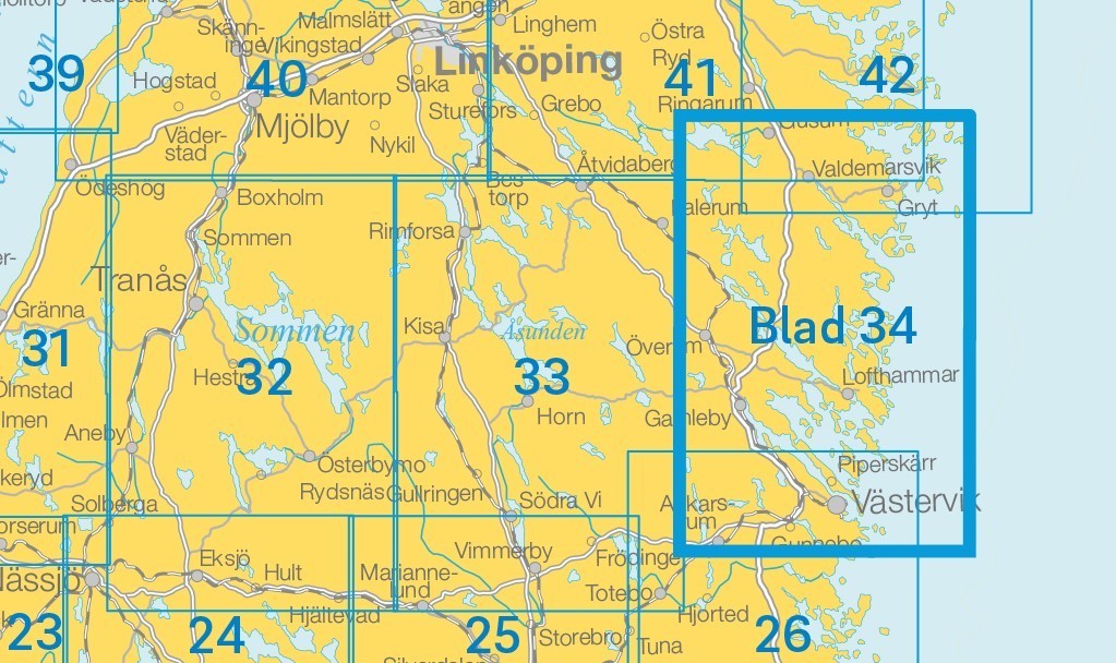 Sverigeserien is een outdoor kaartenserie bestaande uit 116 bladen met betrekking tot het zuiden en midden van Zweden en de noordelijke kustlijn. De kaart is geschikt voor outdoor activiteiten zoals wandelen, excursies, parcourslopen, jagen, vissen, paardrijden, fietsen, mountainbiken, kajakken, schaatsen en nog veel meer. Elke kaart beslaat een oppervlakte van 45x68km.Deze topografische kaarten op schaal 1:50 000 bevatten alle informatie die nodig is voor buitenactiviteiten: terreininformatie, wandelpaden, verlichte paden, campings, schuilplaatsen, golfbanen, (buiten) zwembaden, historische overblijfselen, wegen in verschillende categorieën, spoorlijnen en nog veel meer.
