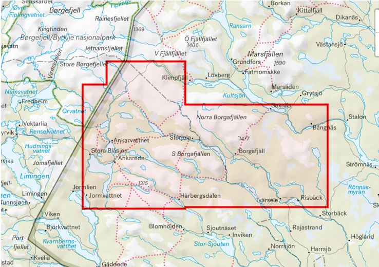 Dit is de allereerste bergkaart op een schaal van 1:50.000 van Borgafjäll en zijn omgeving. De kaart beslaat het gebied ten zuiden van Klimpfjäll en Saxnäs in het noorden tot Stora Blåsjön en Risböck in het zuiden.