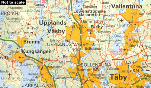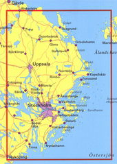 The environs of Stockholm and Uppsala on a detailed road map highlighting campsites and youth hostels, golf courses, marinas, places of interest, etc. The map presents the area’s road network in great detail, including privately maintained roads opened to general traffic. Railway lines are shown with stations and car ferry routes are marked, but the network of the ferry connections between the islands is not shown as extensively here as on the Stockholm and the Islands map.