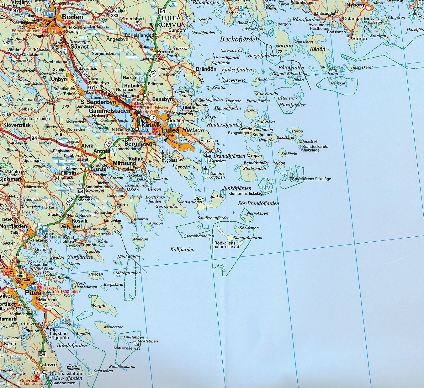 Mooie duidelijke wegenkaart van Noord Zweden, gebied Östersund - Umea - Lulea  Met o.a. campings, jeugdherbergen, wegnummers en bezienswaardigheden aangegeven.