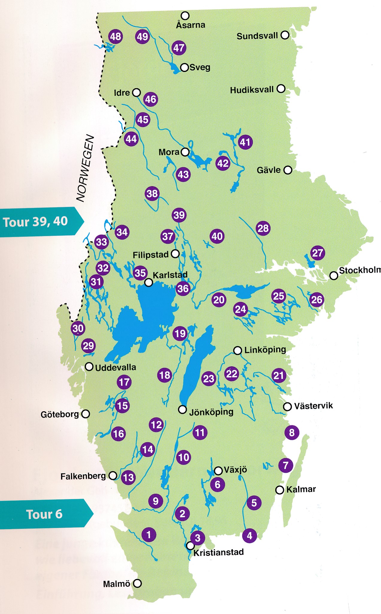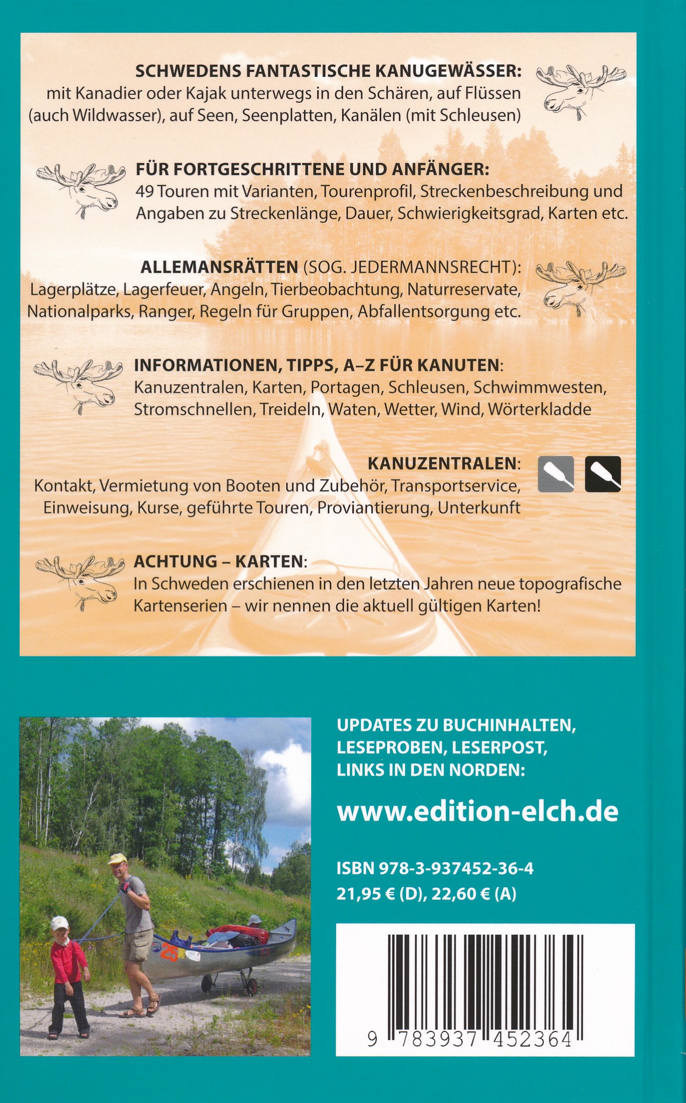 Der unseres Wissens momentan einzige überregionale Schweden-Kanuguide Schweden liegt in aktualisierter dritter Auflage vor. Das Buch enthält 49 Kanugewässer in Süd- und Mittelschweden. Die Touren sind teils miteinander zu kombinieren und teils sogar in mehreren Varianten vertreten, so dass es sich insgesamt um mehr als 50 Strecken zur Auswahl handelt. Zu den vorgestellten Kanurevieren gehören Lagaleden, Tidan, Fegen, Ätran, Glaskogen, Nissan, Båven, Rönne å, Immeln und Halen, Strömsholmskanal, Fuluälven, Tiveden, Ronnebyån, Flottarleden, Bullareleden, Svartälven, Stångån, Veman, Rogen, Ljusnan u.a.