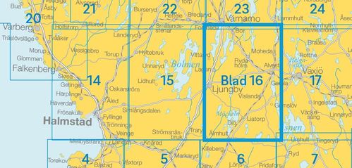 Sverigeserien is een outdoor kaartenserie bestaande uit 116 bladen met betrekking tot het zuiden en midden van Zweden en de noordelijke kustlijn. De kaart is geschikt voor outdoor activiteiten zoals wandelen, excursies, parcourslopen, jagen, vissen, paardrijden, fietsen, mountainbiken, kajakken, schaatsen en nog veel meer. Elke kaart beslaat een oppervlakte van 45x68km.Deze topografische kaarten op schaal 1:50 000 bevatten alle informatie die nodig is voor buitenactiviteiten: terreininformatie, wandelpaden, verlichte paden, campings, schuilplaatsen, golfbanen, (buiten) zwembaden, historische overblijfselen, wegen in verschillende categorieën, spoorlijnen en nog veel meer.